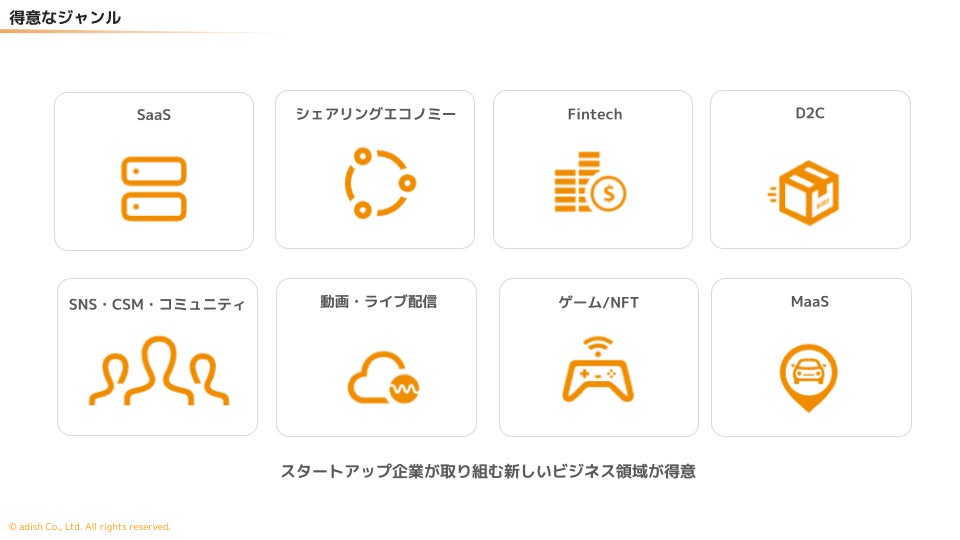 アディッシュは、カスタマーサクセスによるスタートアップの成長支援を行っています。SaaS、シェアリングエコノミー、Fintech、SNS、動画・ライブ配信、ゲーム/NFT、MaaSの領域に強みがあり、創業間もないスタートアップから時価総額1,000億円を超える企業まで支援実績があります。