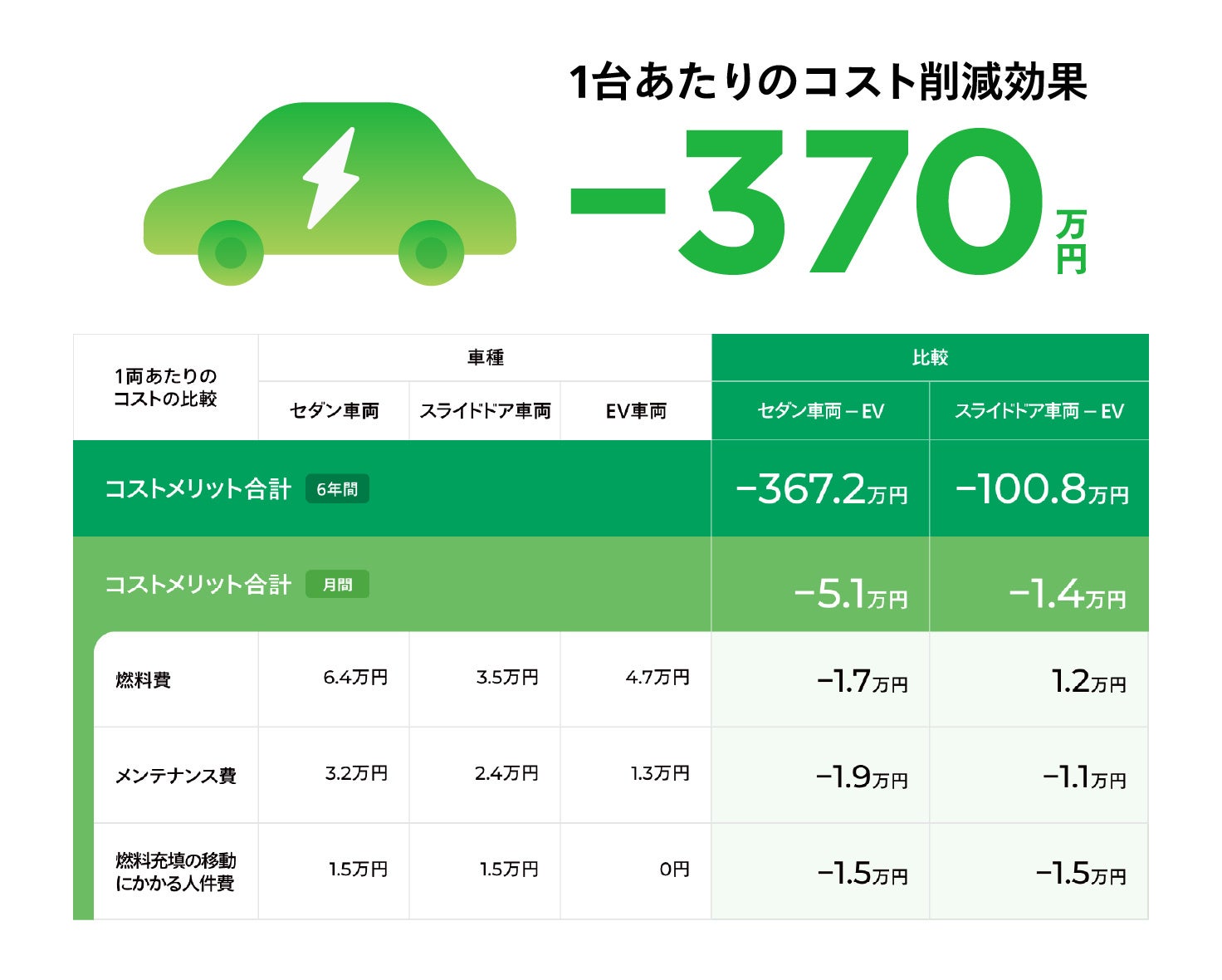 タクシーで一般的なLPG車(セダン車両・スライドドア車両)とEVについて、実際の運行状況下でのコストを比較したところ、燃料費(LPGまたは電力)、メンテナンス費(車検、点検修理理ほか)、燃料充填にかかる移動等の人件費の3項目を加味した車両1台あたりの6年間の合計では、セダン車両は約370万円、スライドドア車両は約100万円のコスト削減が期待できるという試算となりました。