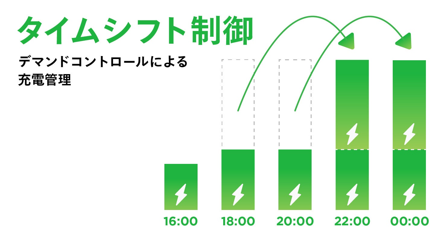 本プロジェクトでは、RE100(100%再生可能エネルギー)を調達していますが、遠隔制御にて普通充電器の出力をデマンドコントロールする「タイムシフト制御(充電管理)」を一部のタクシー事業者にて実証を行っています。タクシー運行管理に組み込むことで、毎回の出庫に支障をきたさない計画で充電を行います。