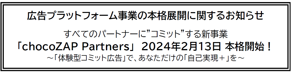 広告プラットフォーム事業の本格展開に関するお知らせすべてのパートナーに”コミット”する新事業「chocoZAP Partners」2024年2月13日 本格開始!