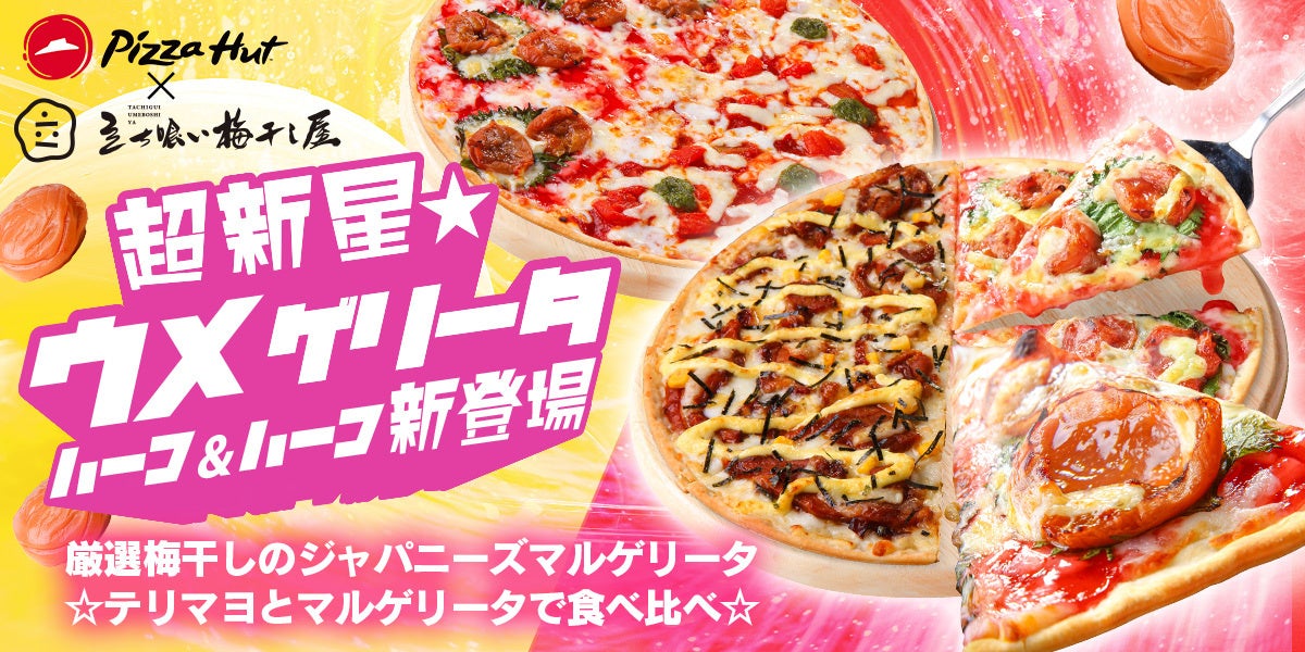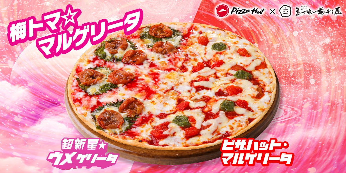 今回、完熟の紀州南高梅である「しらら」を主役に、贅沢に1ピースに1粒まるまるトッピングした【超新星☆ウメゲリータ】は、〈想像以上に梅で草〉〈箱を開けた瞬間から梅の香り〉〈チーズと梅の相性がこんなにいいとは知らなかった〉〈美味しい、レギュラーメニュー化してほしい〉と、梅干し好きの皆様からの嬉しいお言葉を多数SNS上で拝見する一方で、〈めっちゃ気になるけど、1枚まるごと梅は敷居高い〉〈ピザ1枚で食べ比べできるメニュー出してほしい〉など、気になりつつもハードルが高くなかなか踏み出せないという方々の声も拝見し、リクエストにお応えして、「超新星☆ウメゲリータ」と、ピザハットの人気定番ピザ「ピザハット・マルゲリータ」のハーフ&ハーフ「梅トマ☆マルゲリータ」、「超新星☆ウメゲリータ」と「直火焼テリマヨチキン」のハーフ&ハーフ「梅テリ☆マヨチキン」を店舗限定・数量限定にて発売いたします。