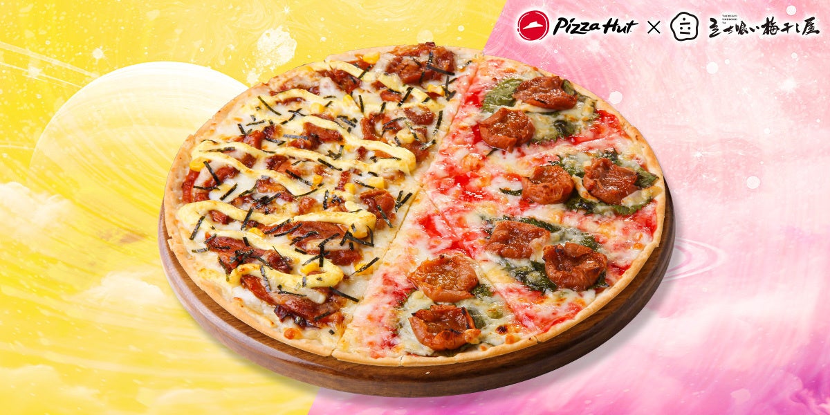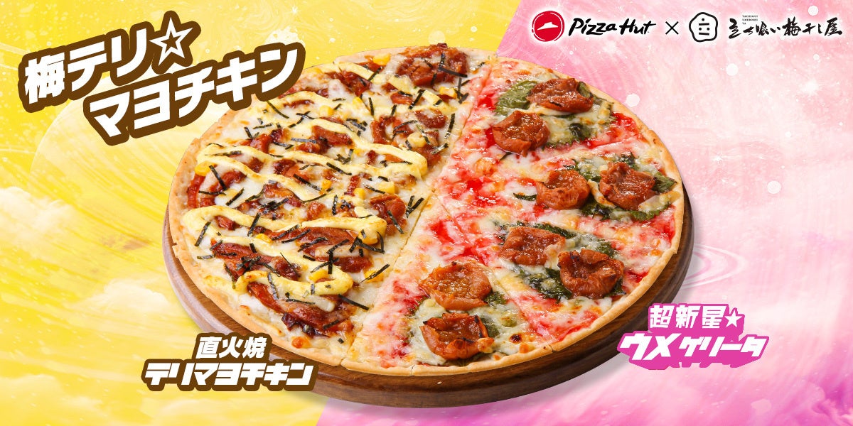 ピザハットの顔ともいえるほのかに甘いイタリアントマト、香り豊かなバジルソース、チーズというシンプルながらも味に絶対の自信を持つ伝統ピザ「ピザハット・マルゲリータ」とのハーフ&ハーフ、厳選した鶏もも肉をピザハット特製の生姜醬油たれでしっかりと味付けし香ばしく焼き上げたテリヤキチキンをたっぷりのせた本格和風ピザ「直火焼テリマヨチキン」とのハーフ&ハーフは、「超新星☆ウメゲリータ」の良さをそのままに食べ比べを堪能いただけるオススメの組み合わせとなっております。