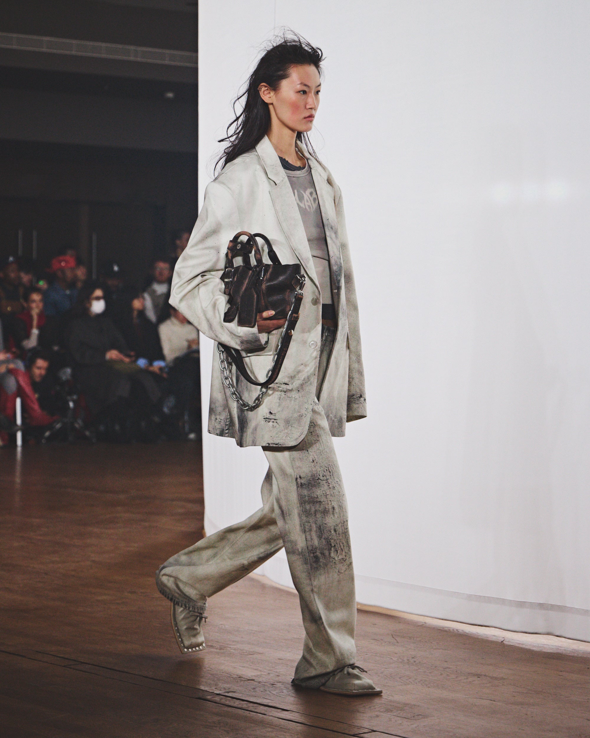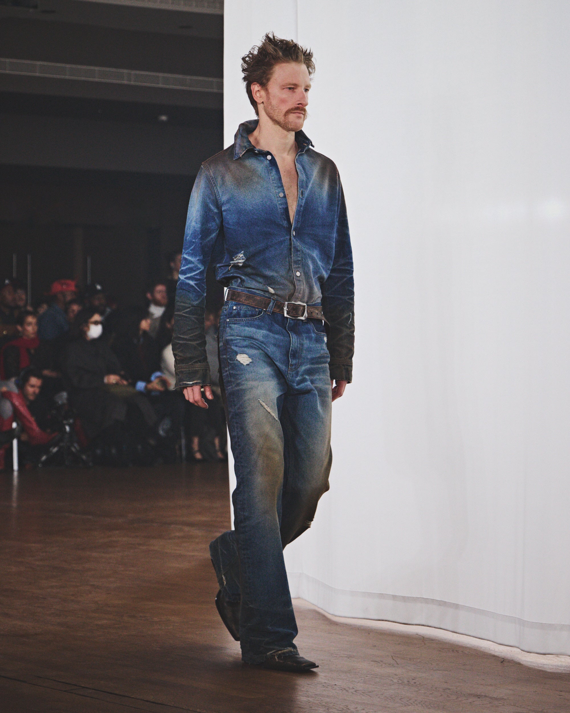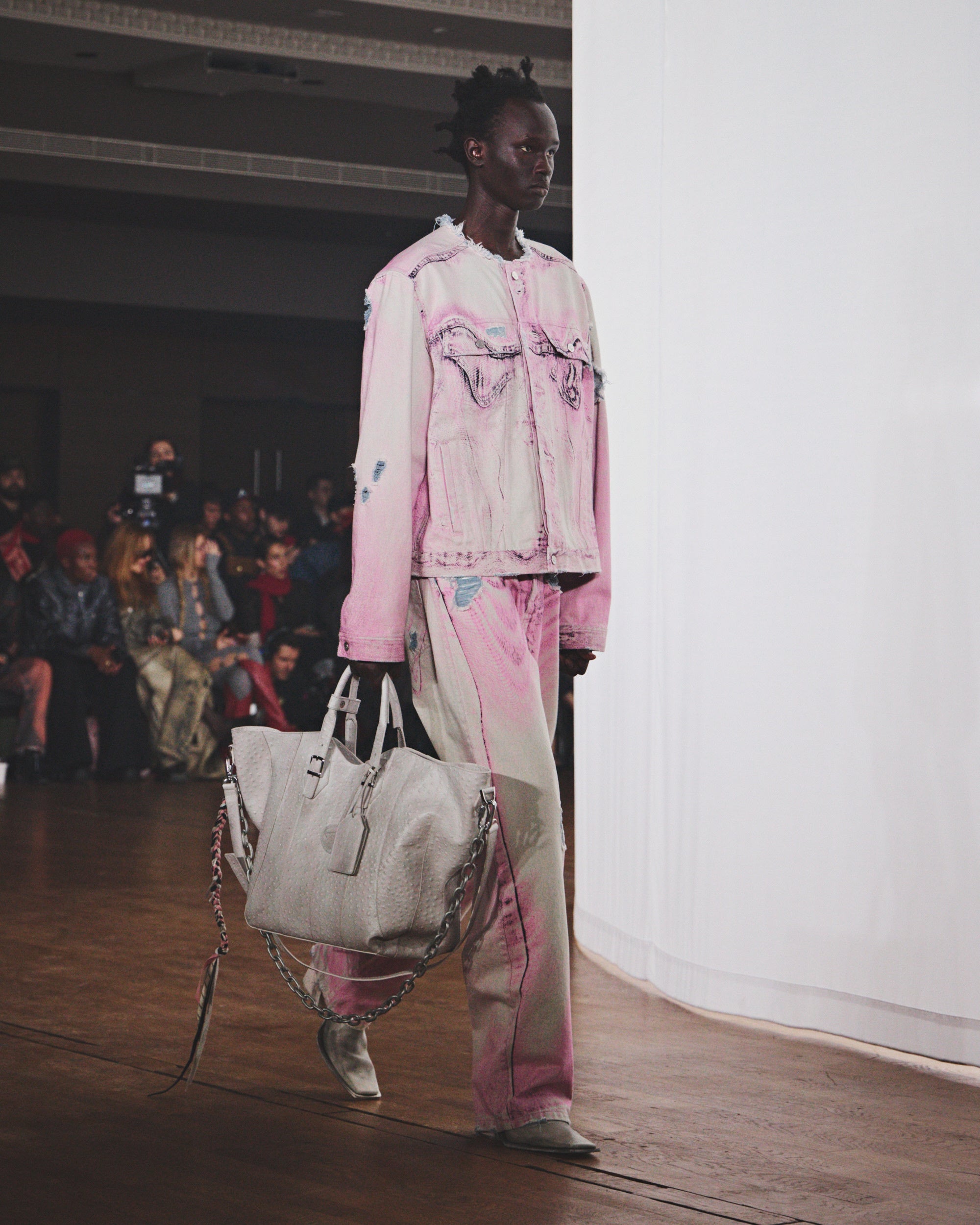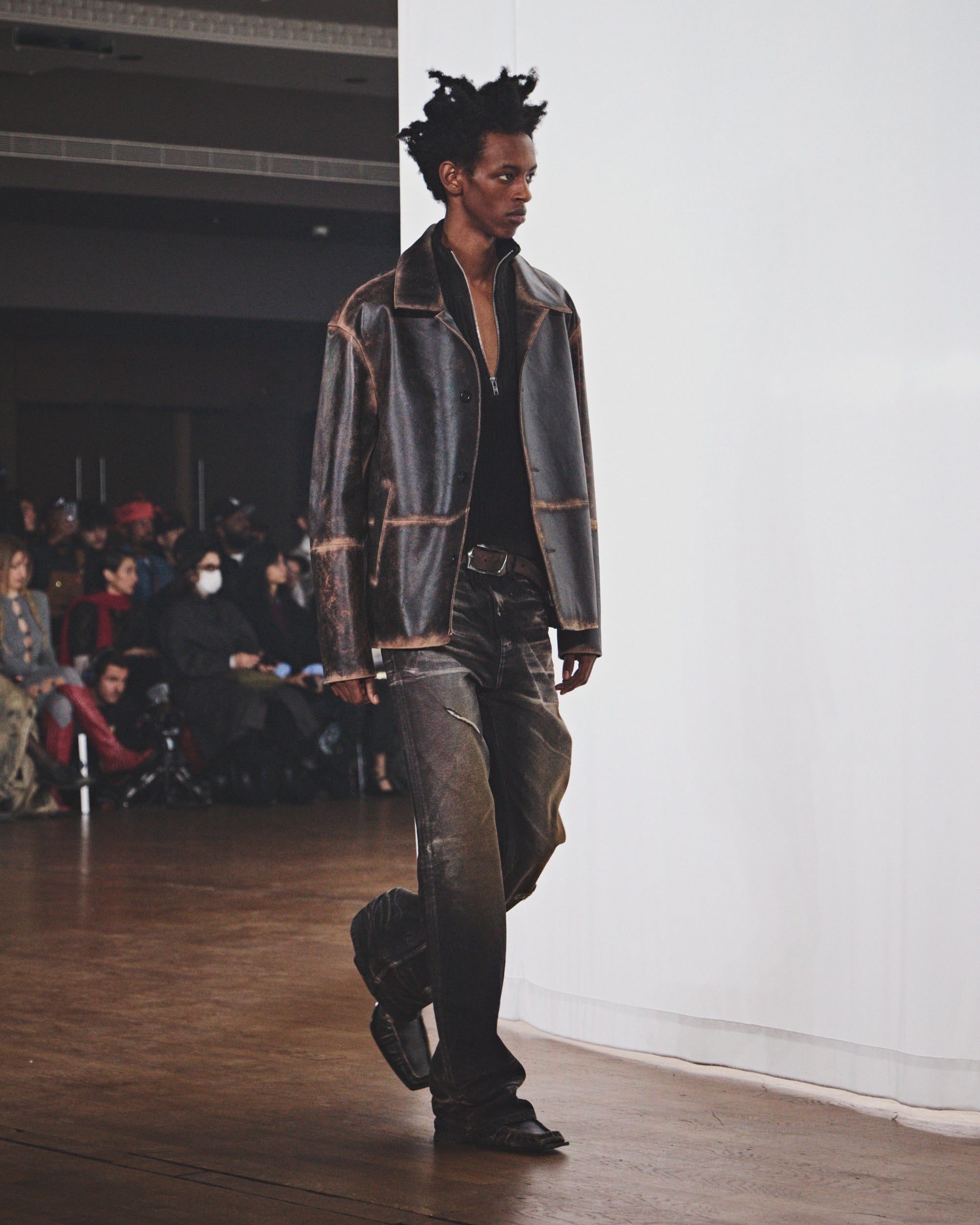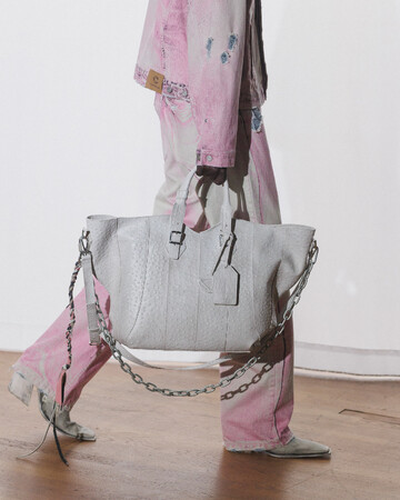 シルエットは縮みとルーズの間を揺れ動き、ダメージ加工や多様な加工、ウォッシュ加工が施されています。その結果、偶然の産物ともいえるハーモニーを保ちながらも、深いパーソナルな感覚を抱かせるコレクションが誕生しました。カラーパレットは、ブラウン、ホワイト、グレー、ライトブルーといった冷たく使い古されたトーンを基調とし、オーロラをイメージしたピンクとペトロールのアクセントが効いています。注目すべき素材には、風合いのあるホワイトのオーストリッチエンボスレザー、厚手のワックスコットン、ロングパイルウール、シグネチャーのブラッシングオフレザー、そしてCAMPERLABならではの加工デニムとクラシックなプリントデニムのミックスなどが挙げられます。
