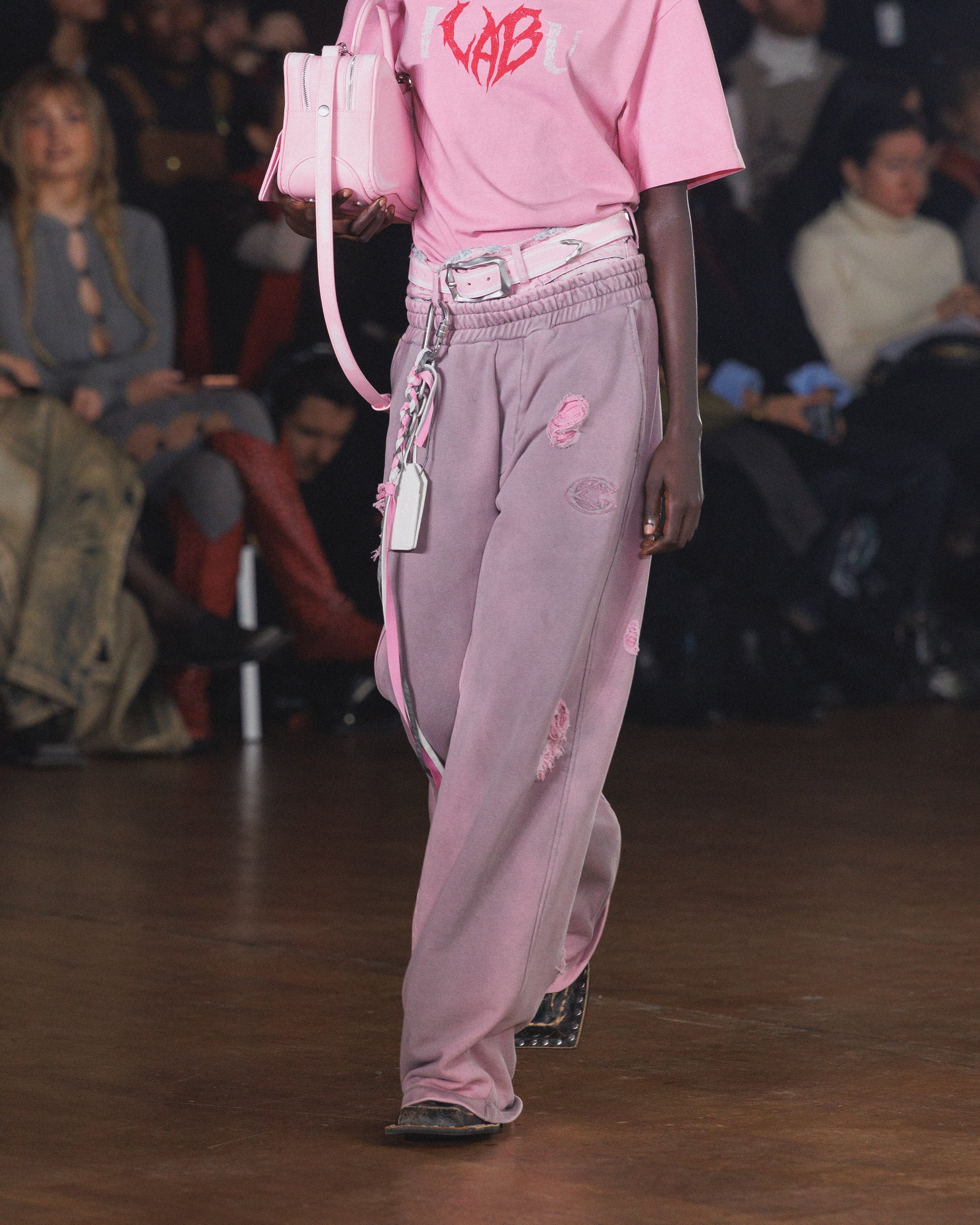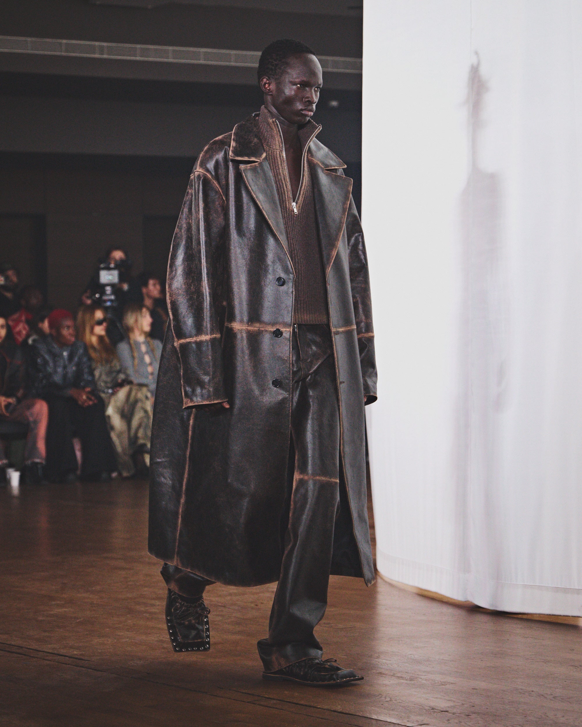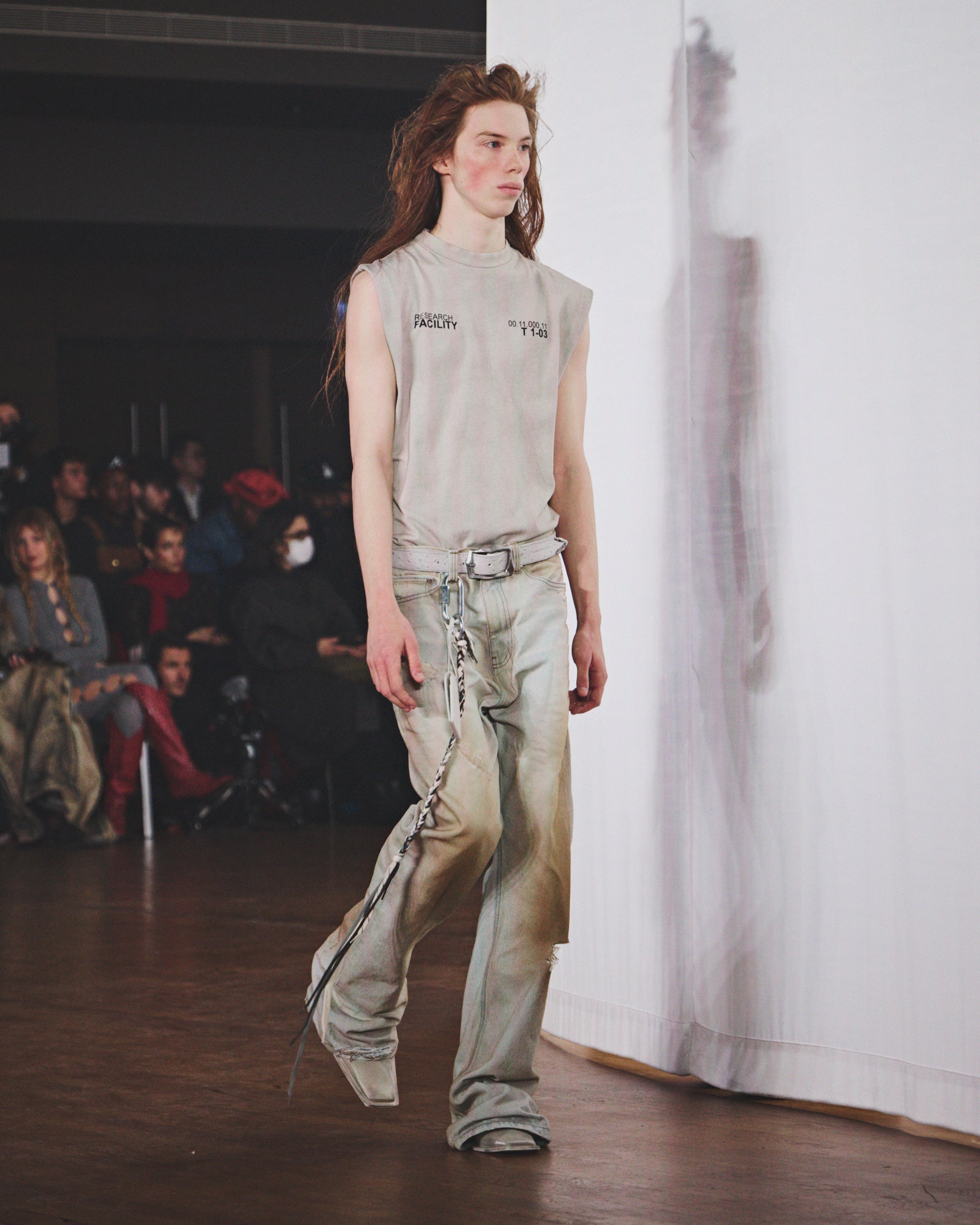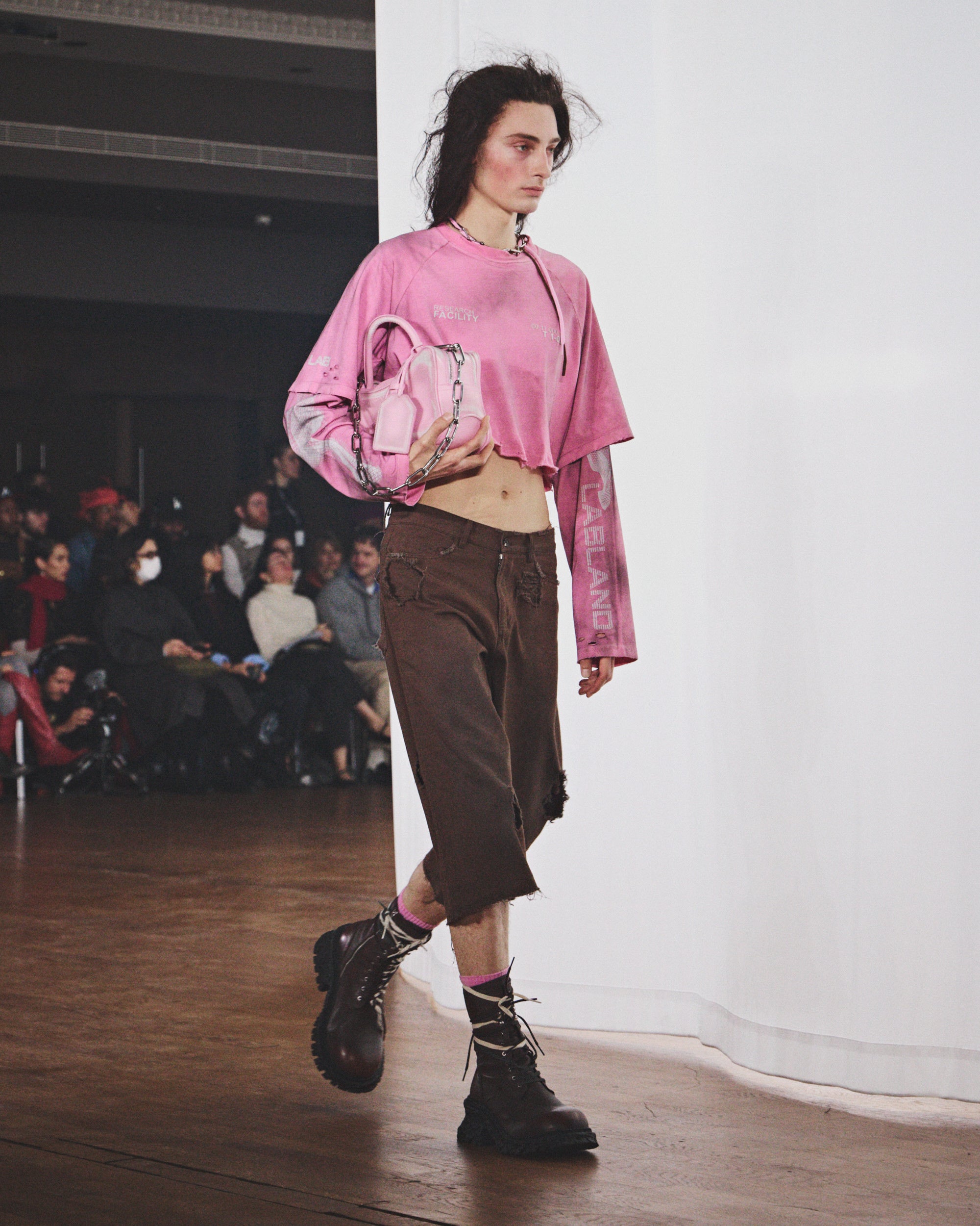 シルエットは縮みとルーズの間を揺れ動き、ダメージ加工や多様な加工、ウォッシュ加工が施されています。その結果、偶然の産物ともいえるハーモニーを保ちながらも、深いパーソナルな感覚を抱かせるコレクションが誕生しました。カラーパレットは、ブラウン、ホワイト、グレー、ライトブルーといった冷たく使い古されたトーンを基調とし、オーロラをイメージしたピンクとペトロールのアクセントが効いています。注目すべき素材には、風合いのあるホワイトのオーストリッチエンボスレザー、厚手のワックスコットン、ロングパイルウール、シグネチャーのブラッシングオフレザー、そしてCAMPERLABならではの加工デニムとクラシックなプリントデニムのミックスなどが挙げられます。