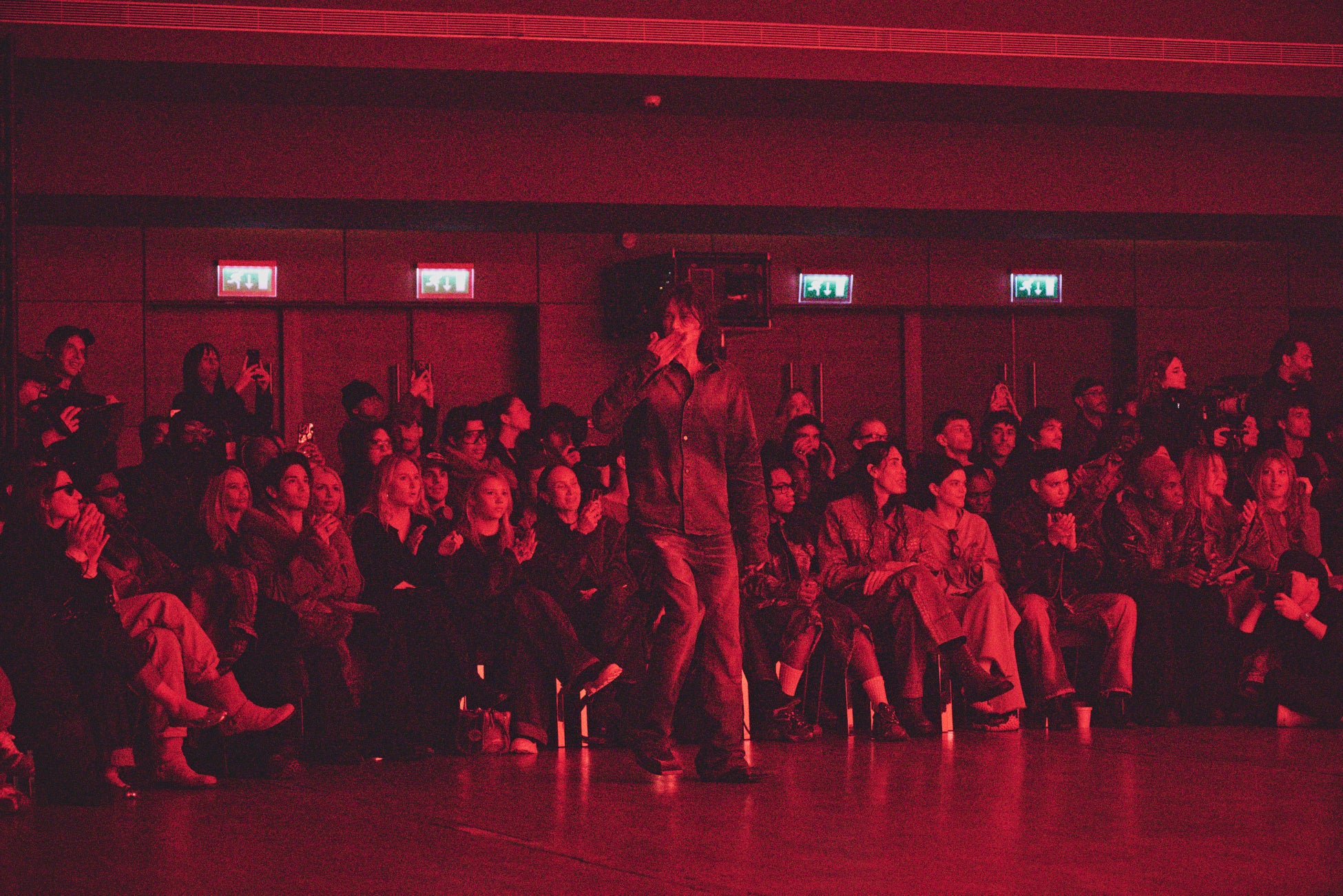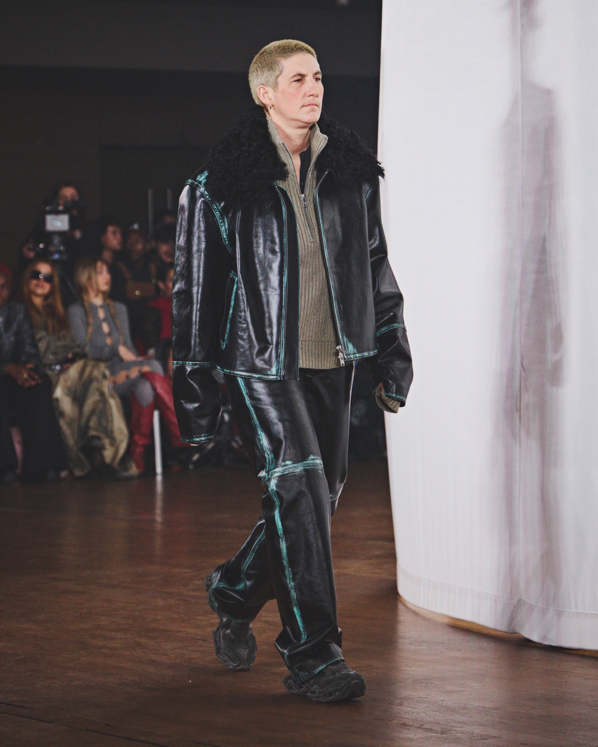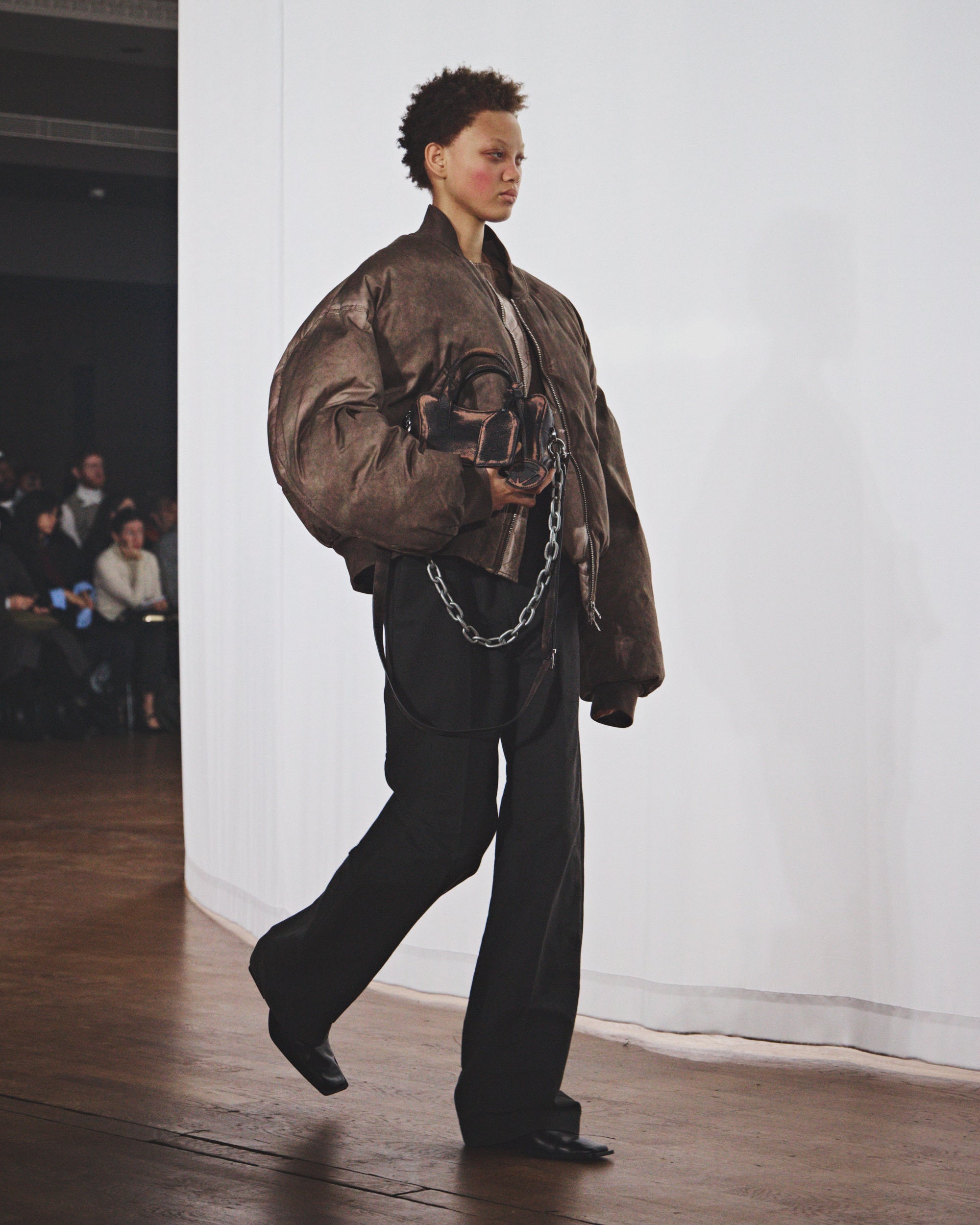 プレゼンテーションには、モデル、タレント、さらにはストリートキャストによる約20名の風になびく人物像が登場しました。氷点下に染まった彼らは、コテージを温めるために薪を集めてきたような者から、長い極夜を耐え抜くための装備を身にまとう者まで、多様な姿を見せました。