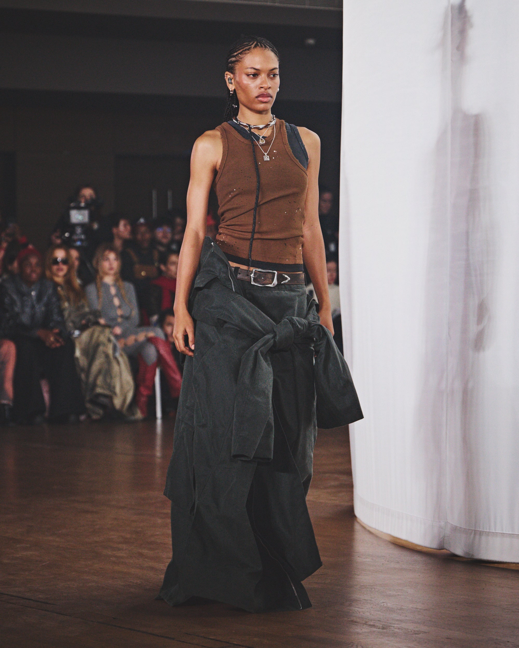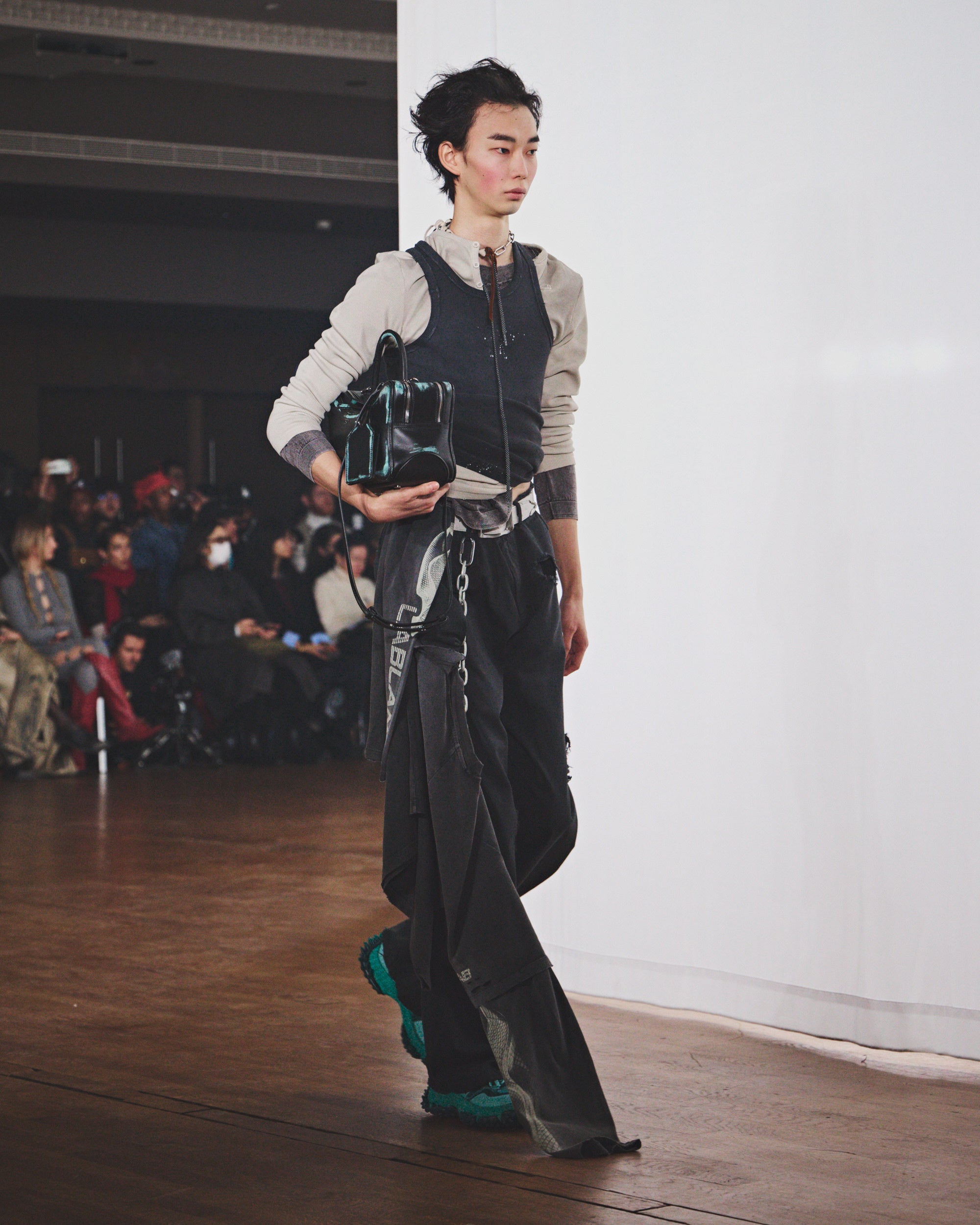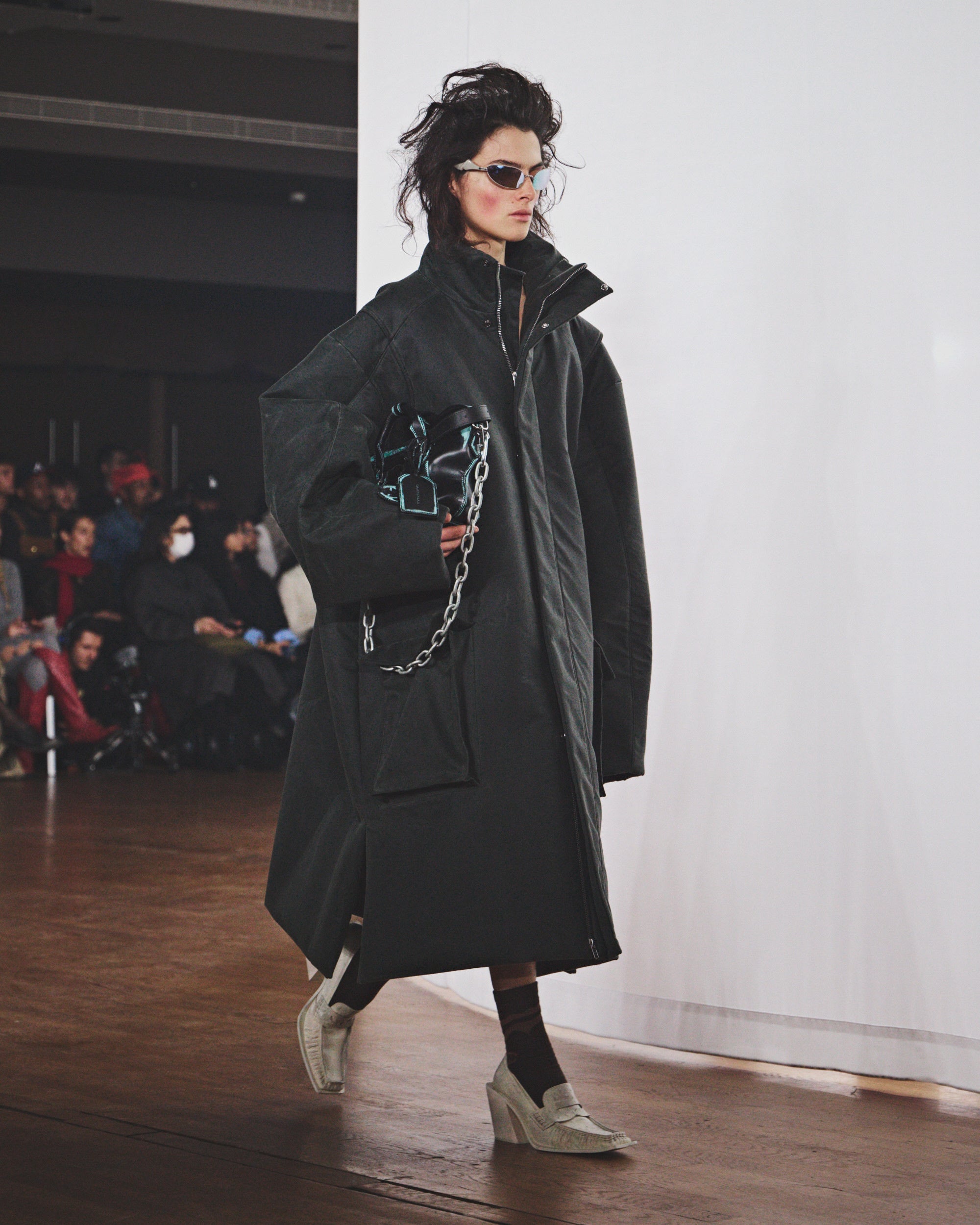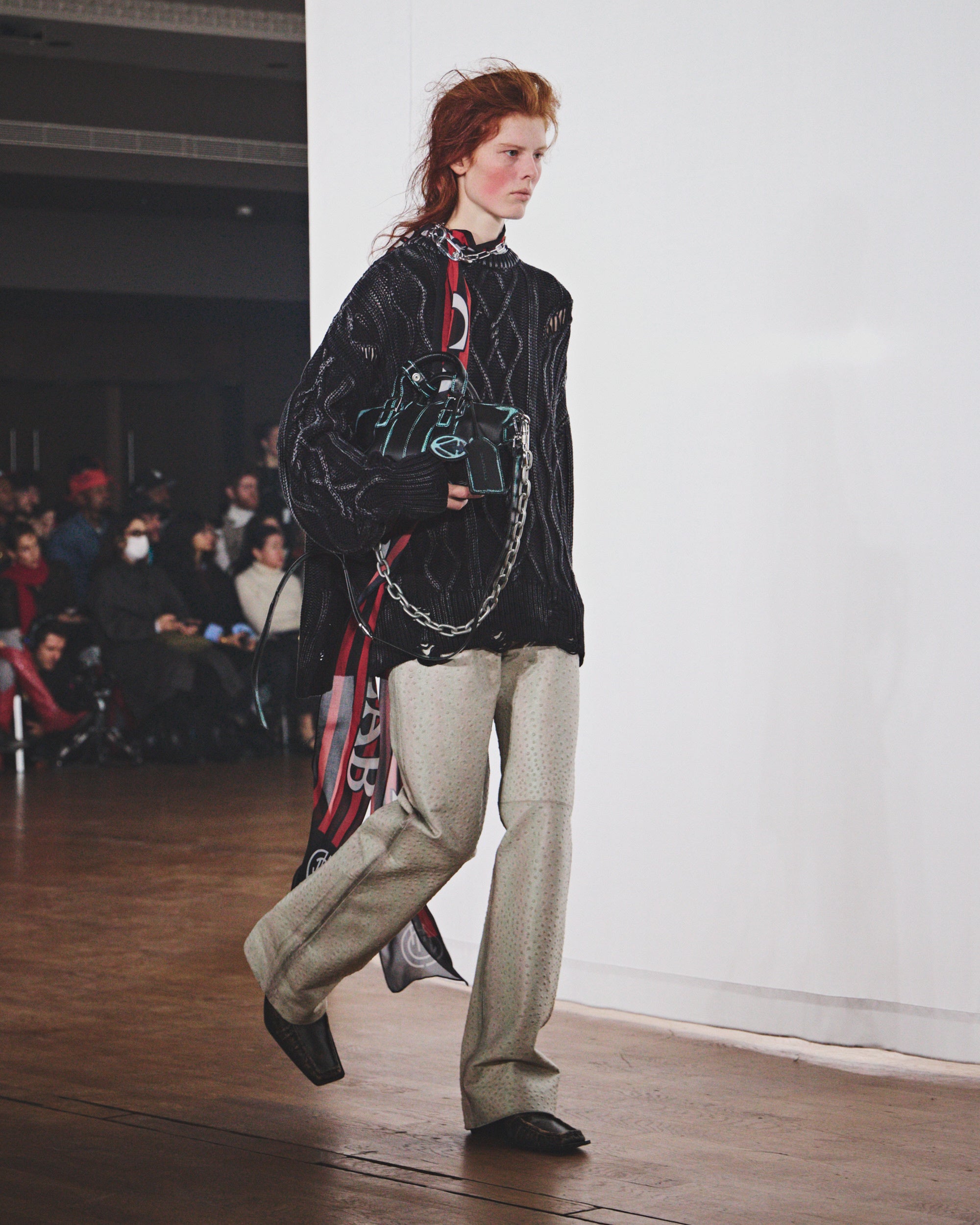 フットウェアでは、猛吹雪にもふさわしい安定感のある「TERROSO」ブーツ、細長いフォルムのヒール「ESCANDALO」ローファーとブーツが登場。さらに、3Dプリントされたアウトソールに連結されたケーブルで構成された、荒削りなデザインの「CANICULA」レザースニーカーも登場。レザーアクセサリーでは、シグネチャーバッグ「LAUKKU」 と「LUNSSI」がよりコンパクトな新サイズに縮小され、歪んだメタルバックルを配した新ベルトも初お目見えしました。
