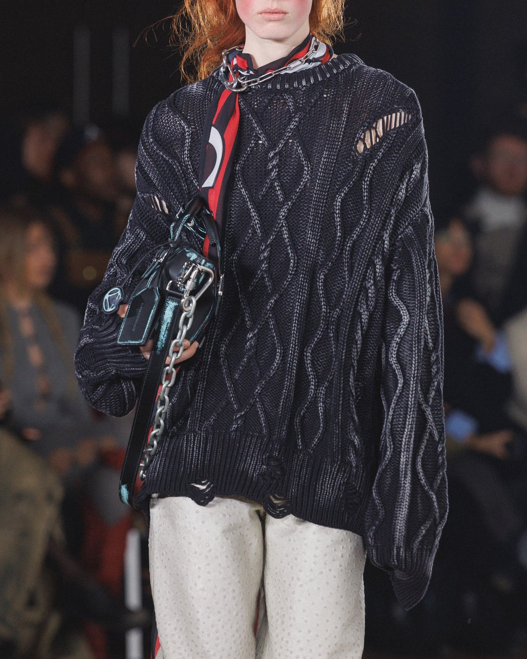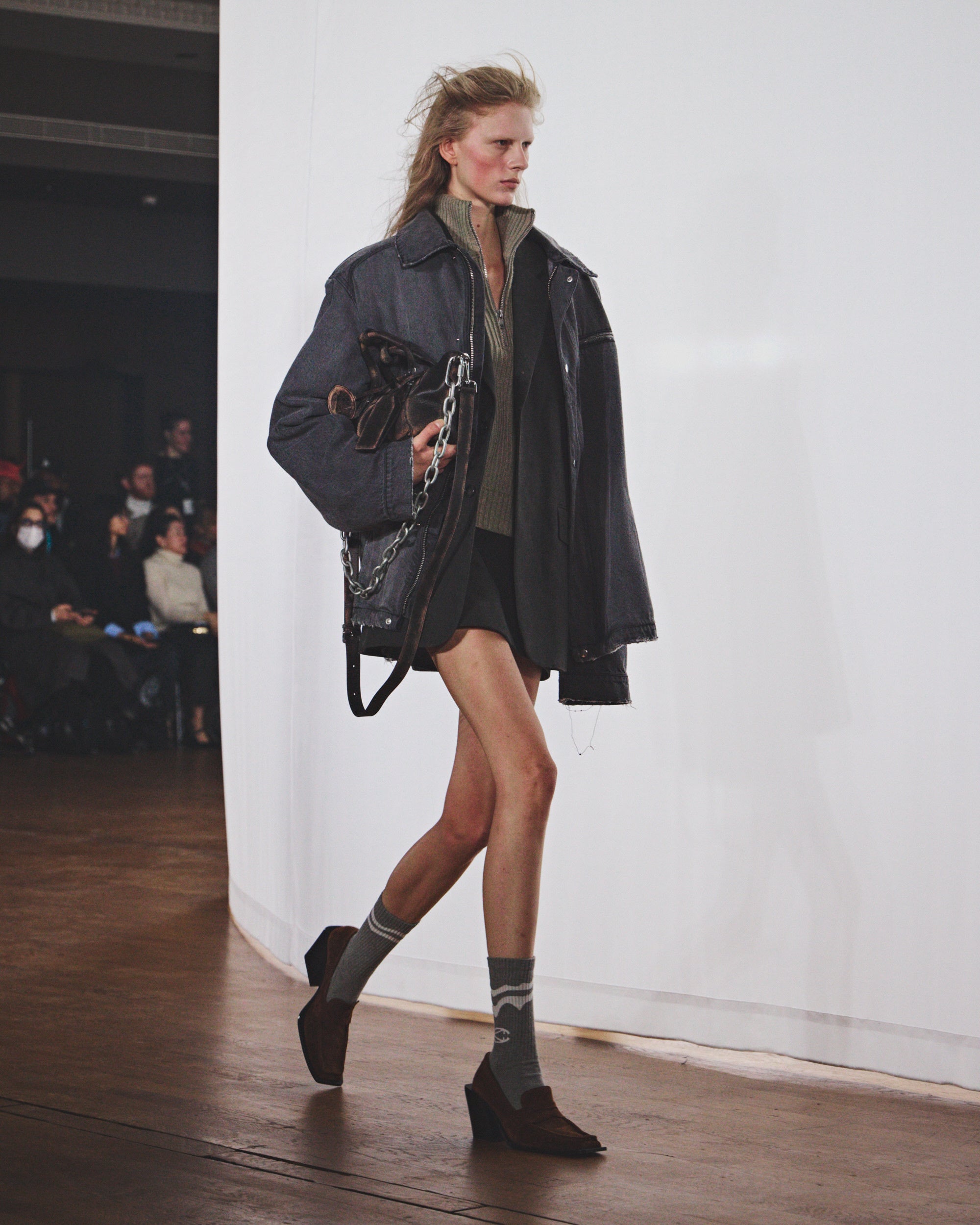 また、吹雪から一時的に抜け出し、緑のフィールドへと視点を移すように、マヨルカ島を代表するサッカーチームである RCD Mallorca とのコラボレーションコレクションも初披露。共通するローカルヘリテージに根ざした継続的なパートナーシップを祝うこのカプセルコレクションでは、クラシックなジャージーの要素に加え、芝の汚れを思わせるデニムジーンズや、伝統的なウールのフットボールマフラーをシルキーでサロン仕様に再解釈したアイテムが登場しました。