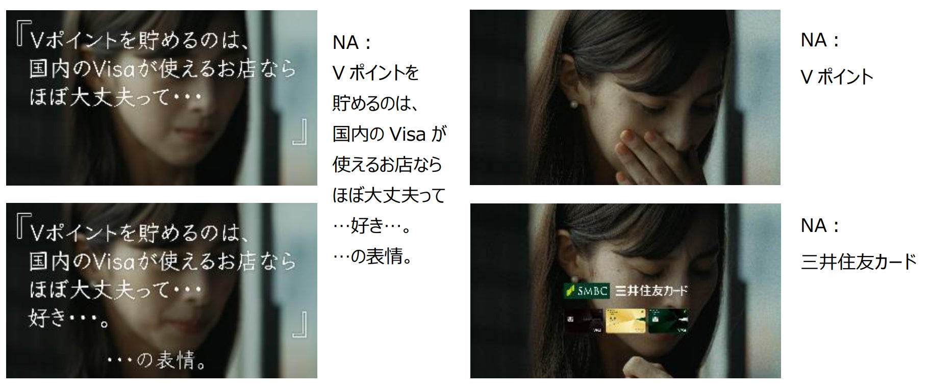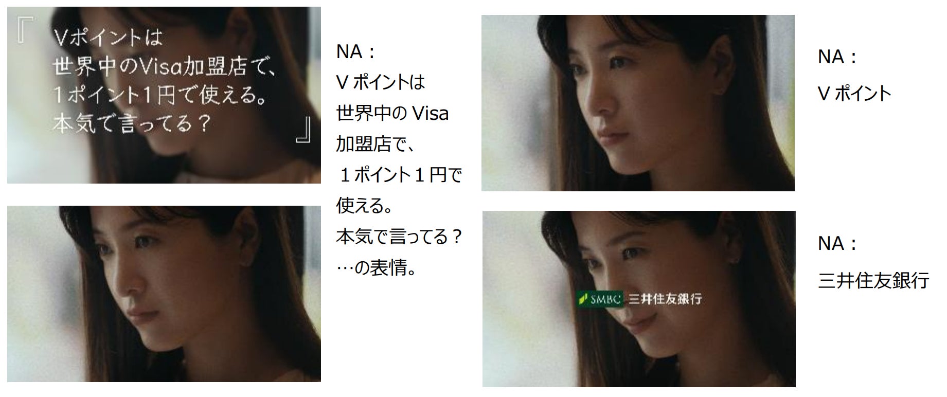 飯塚さん、中条さん、吉高さん、内村さんがそれぞれ、三井住友カードと三井住友銀行のCMシリーズで演じているキャラクターとして登場。仕事の移動中やカフェ、コンビニといった日常生活の中で、「Vポイント」というサービスに思いを巡らせていた4人が、ふとそのメリットの大きさに気づく瞬間的な表情の変化を、アップ中心のワンカットで表現しました。4人のキャストによるセリフ無しのお芝居が、すべて同じフォーマットで描かれる本CMでは、キャラクター毎に異なる四者四様の多彩な表情を楽しみながら、「Vポイント」が貯まる具体的なシーンや使えるシチュエーション、国際ブランドVisaに基づくポイントならではの利便性を実感することができます。