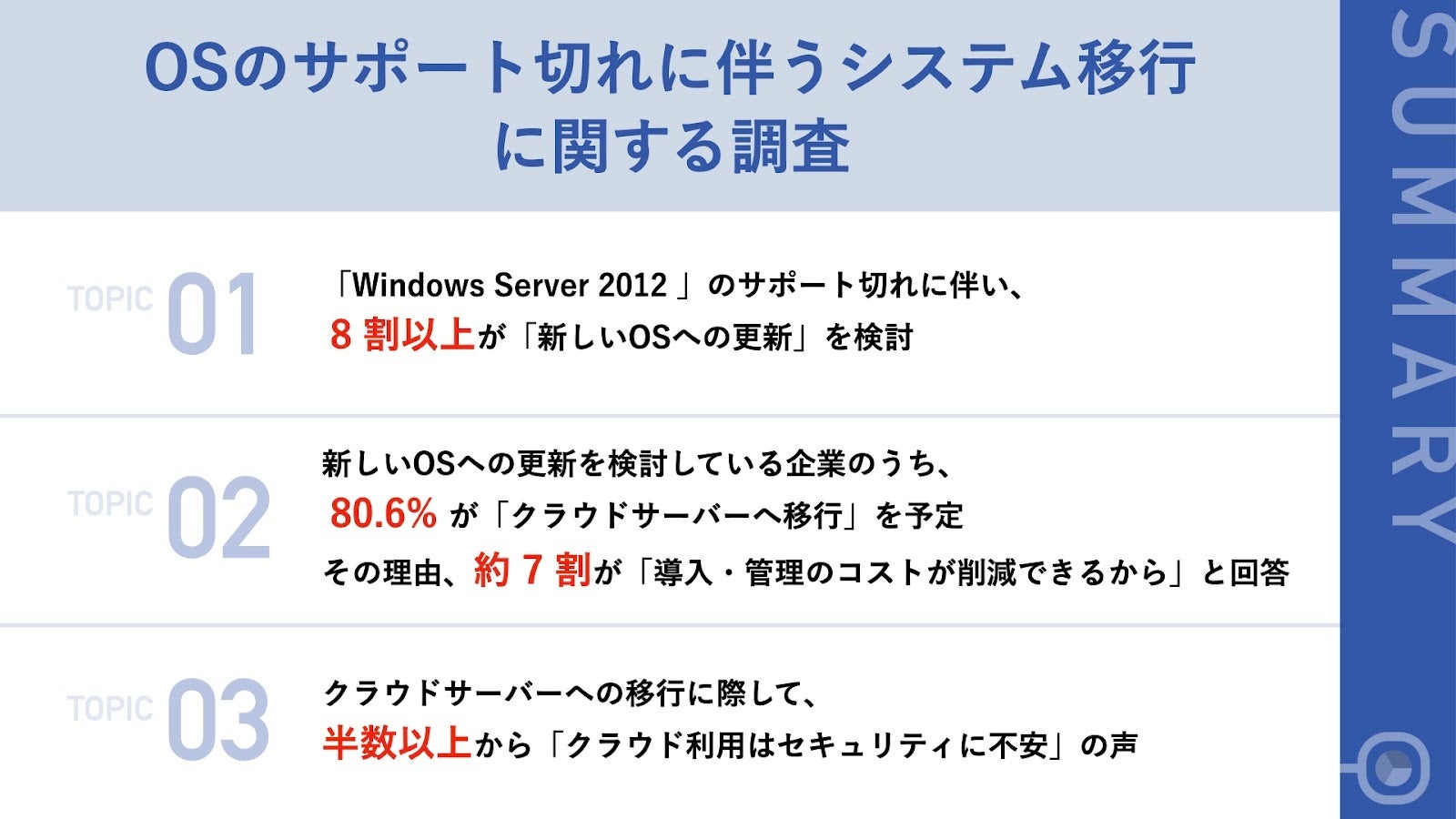 今回の調査では、Windows Server 2012 を活用してきた企業の情報システム担当者において、新しいクラウドサーバーへ移行するための作業が待ったなしの状況となっていることが明らかとなりました。移行手続きを主導する情報システム担当者にとって、安全性の確保やスムーズな新サーバーへの移行など、重大な責任がのしかかっています。システム担当者が移行作業を無事完了させるためには、経営者だけでなく、実際にデータを取り扱う現場からの理解や協力が必須と言えるでしょう。