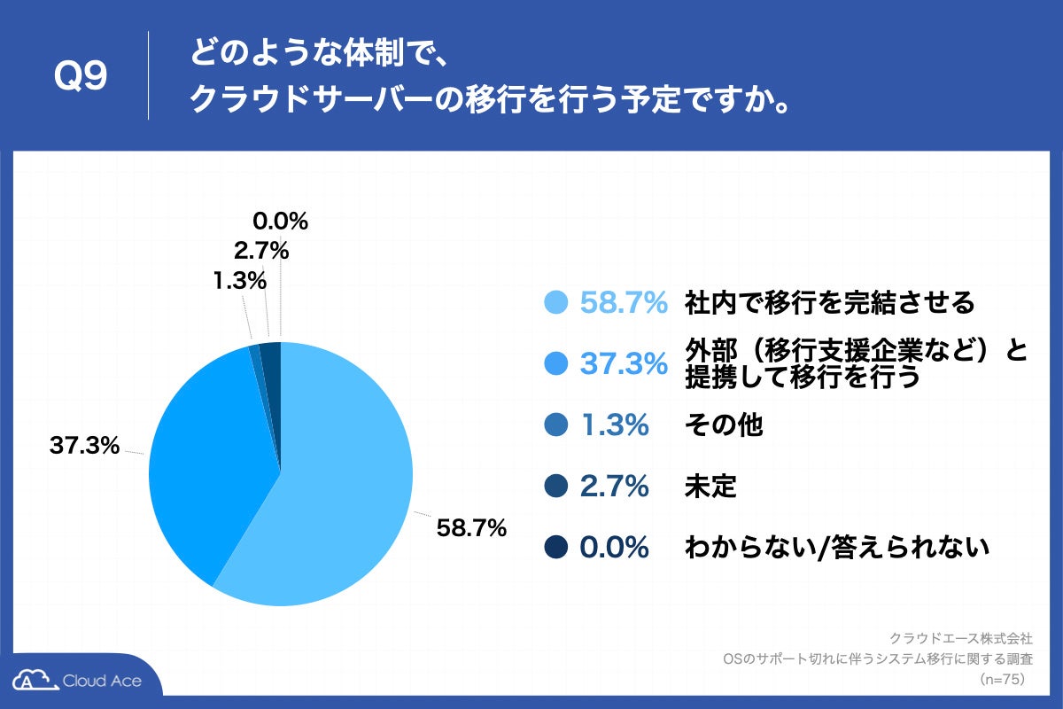 Q2 で「クラウド」と回答した方に、「Q9 どのような体制で、クラウドサーバーの移行を行う予定ですか。」(n= 75 )と質問したところ「社内で移行を完結させる」が 58.7%、「外部(移行支援企業など)と提携して移行を行う」が 37.3% という回答となりました。
