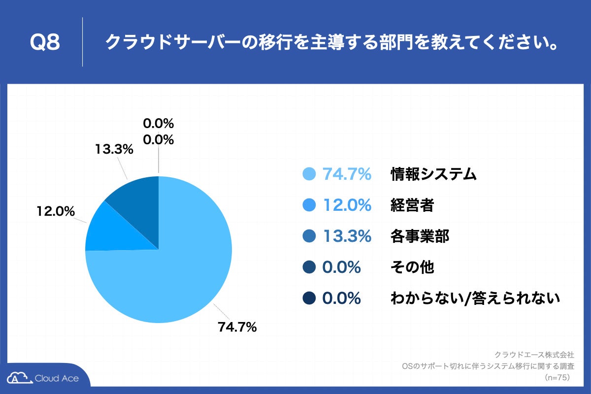 Q2 で「クラウド」と回答した方に、「Q8 クラウドサーバーの移行を主導する部門を教えてください。」(n= 75 )と質問したところ、「情報システム」が 74.7% 、「経営者」が 12.0% という回答となりました。