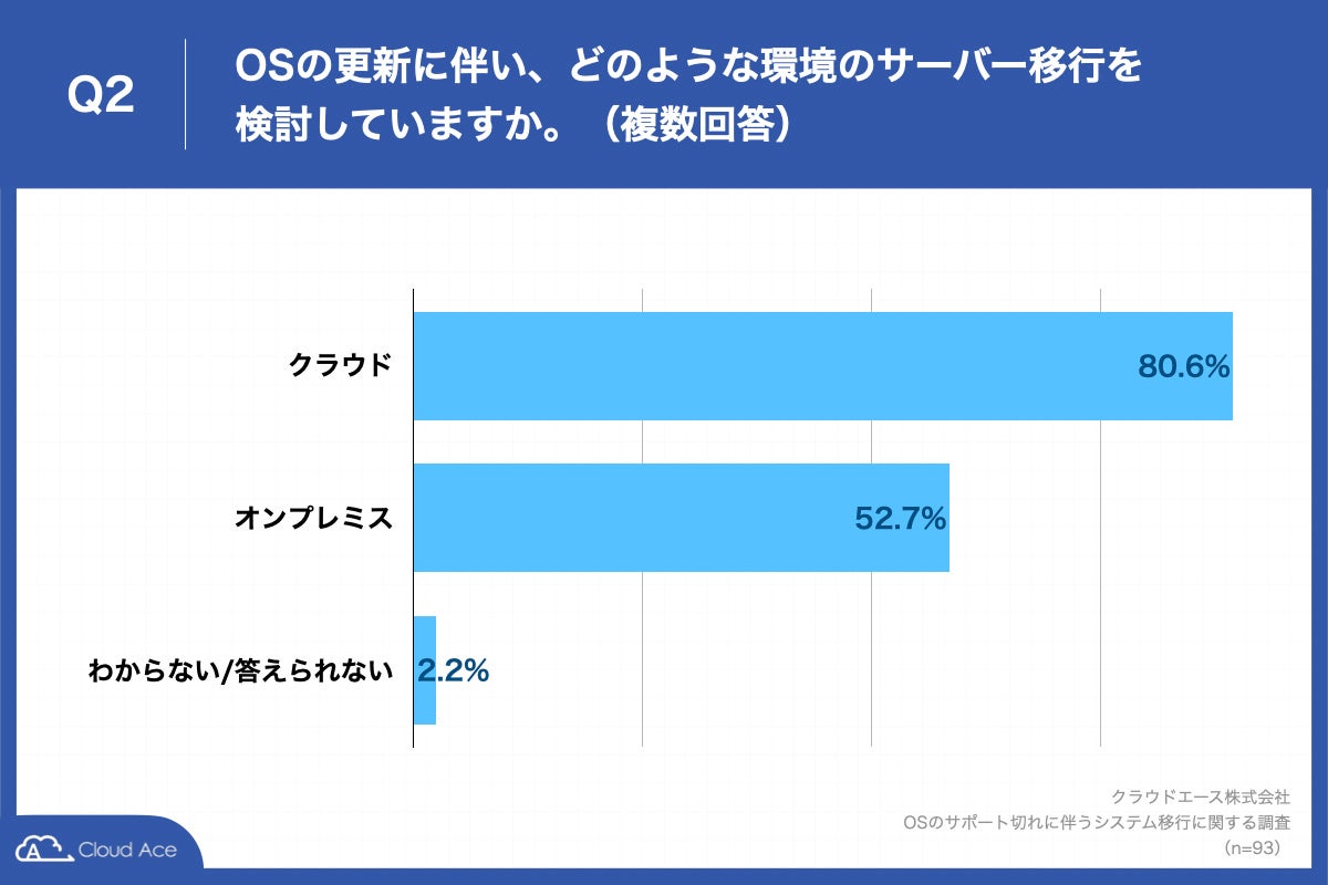 Q1 で「新しい OS に更新する」と回答した方に、「Q2 OS の更新に伴い、どのような環境のサーバー移行を検討していますか。(複数回答)」(n= 93 )と質問したところ、「クラウド」が 80.6% 、「オンプレミス」が 52.7% という回答となりました。