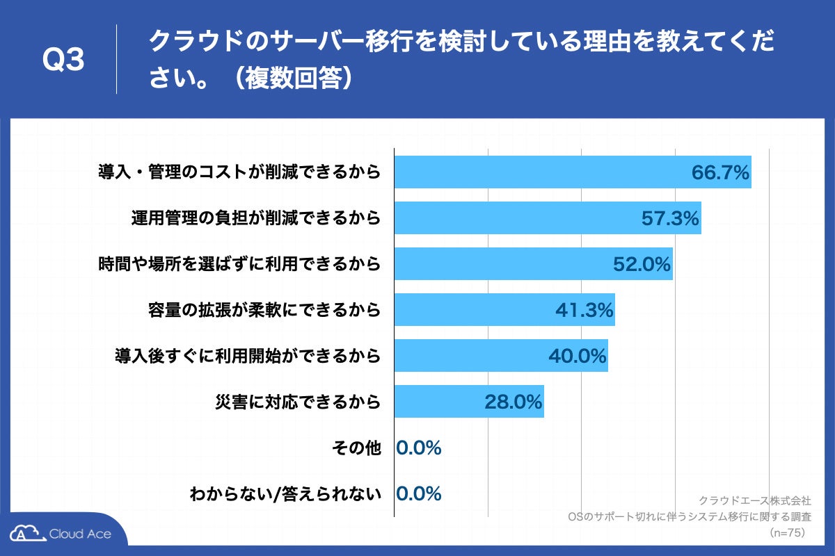 Q2 で「クラウド」と回答した方に、「Q3 クラウドのサーバー移行を検討している理由を教えてください。(複数回答)」(n= 75 )と質問したところ、「導入・管理のコストが削減できるから」が 66.7% 、「運用管理の負担が削減できるから」が 57.3% 、「時間や場所を選ばずに利用できるから」が 52.0% という回答となりました。