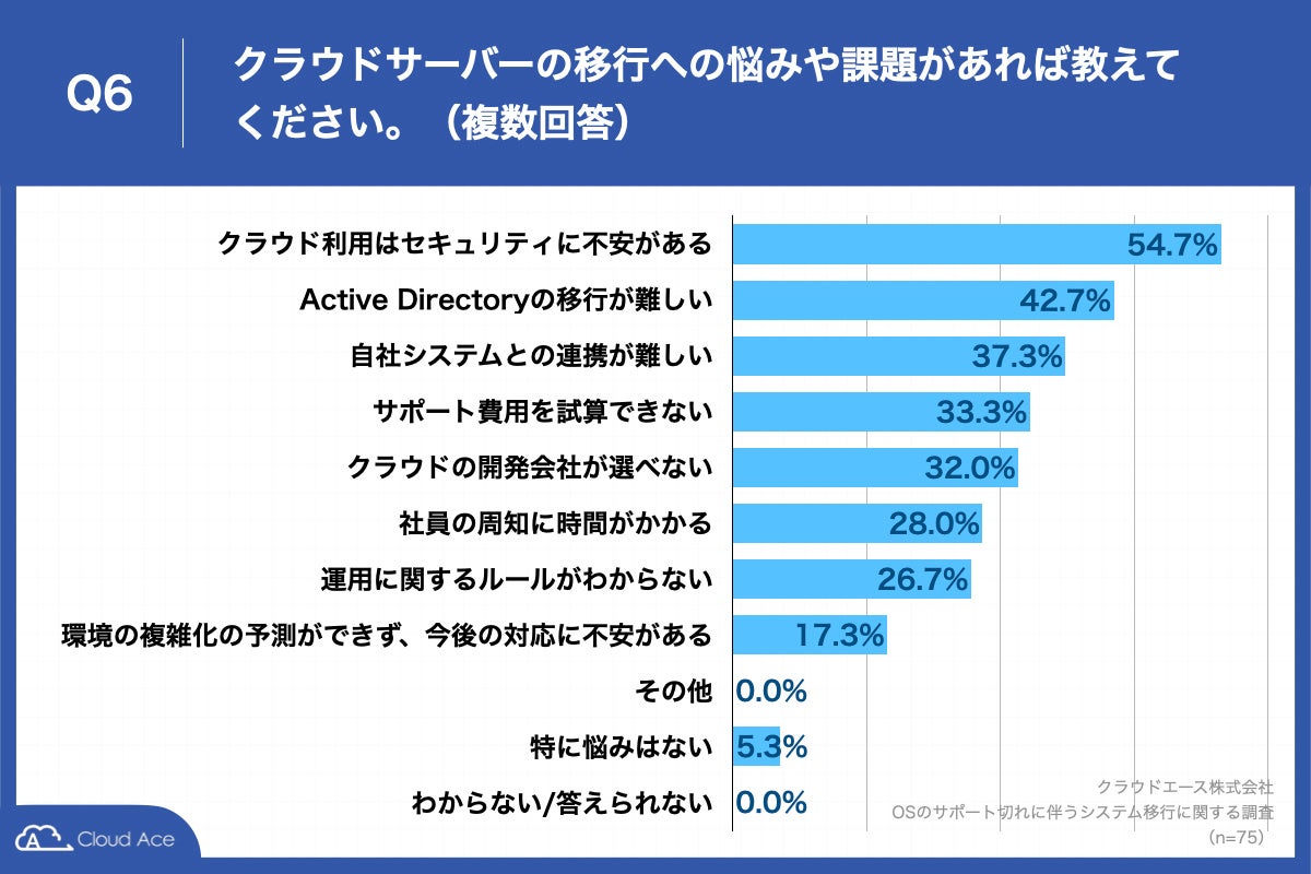 Q2 で「クラウド」と回答した方に、「Q6 クラウドサーバーの移行への悩みや課題があれば教えてください。(複数回答)」(n= 75 )と質問したところ、「クラウド利用はセキュリティに不安がある」が 54.7% 、「Active Directoryの移行が難しい」が 42.7% 、「自社システムとの連携が難しい」が 37.3% という回答となりました。