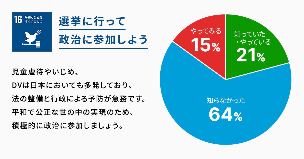 また、ゴール16に関しては、「知らなかった」と回答した割合が非常に多い一方、「やってみる」と回答した割合が15%と、全体と比較しユーザーの興味関心が低い結果となりました。政治自体への関心・参加意欲が低いという可能性が考えられます。