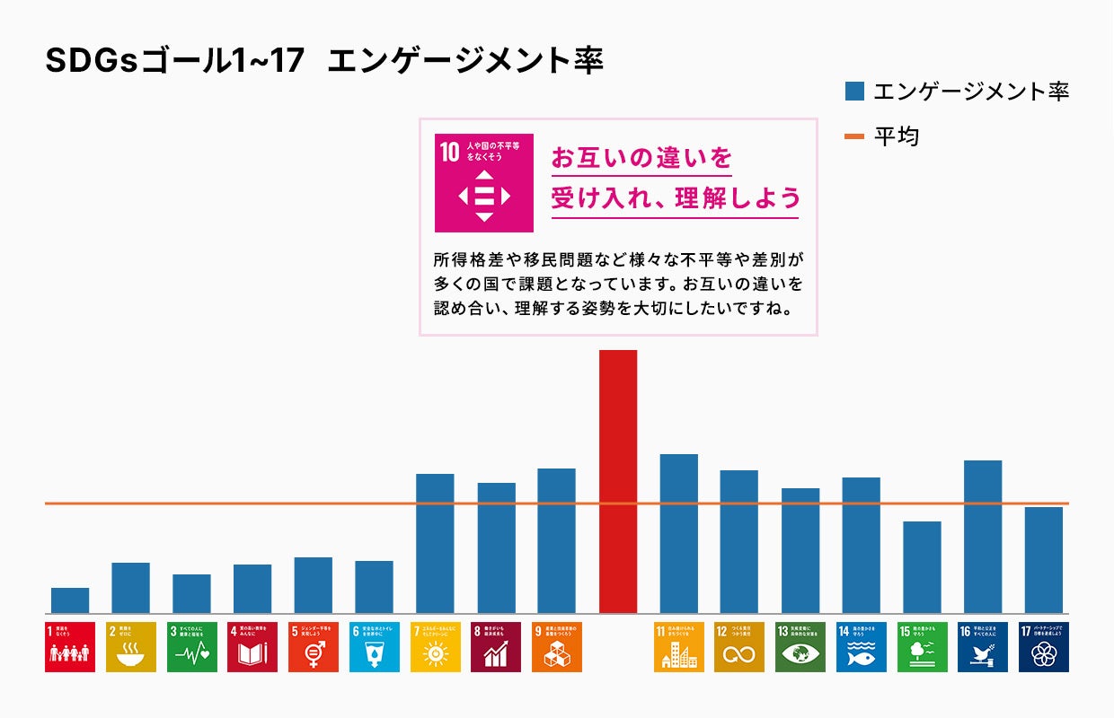 そしてすべてのゴールのうち、最もエンゲージメント率(広告表示のうち、タップやリンククリックなど、ユーザーが広告に接触した割合)が高かったのはゴール10「人や国の平等をなくそう」となりました。今回の配信において最もユーザーの興味関心をひいたと言い換えることができ、不平等や差別をなくすため、互いの違いを理解することの重要性が広まってきていることがうかがえます。