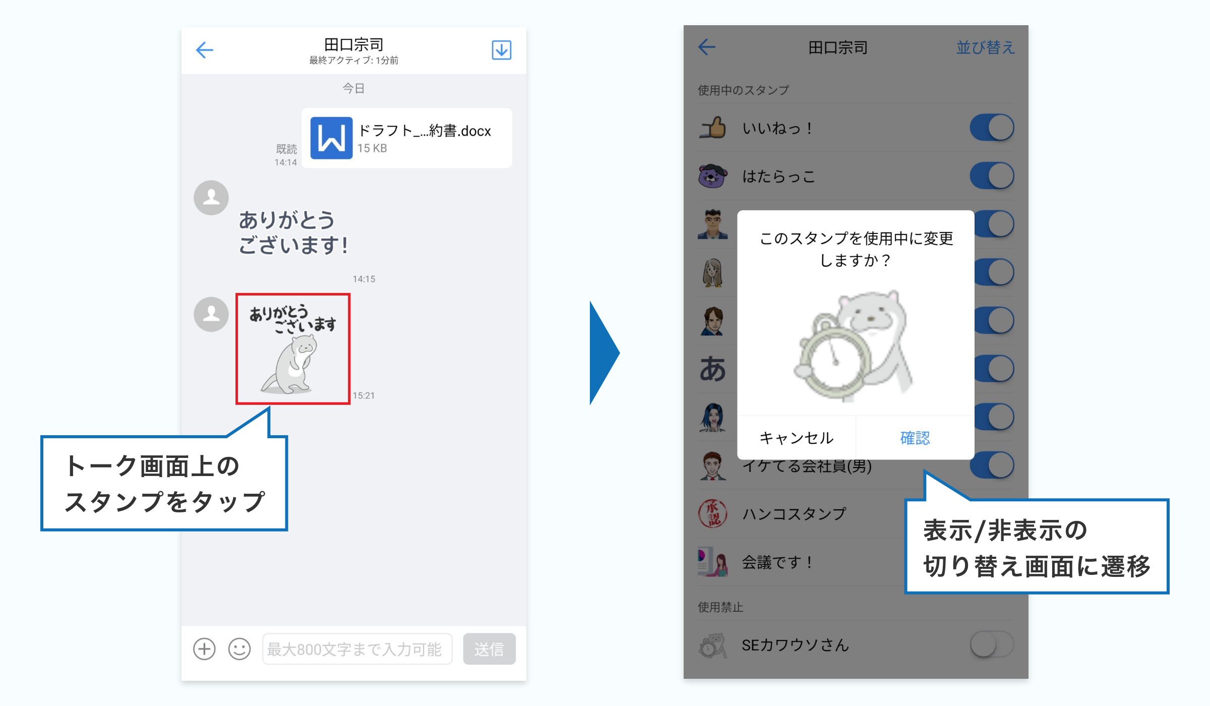 使用禁止に設定しているスタンプ:スタンプの表示/非表示切り替え画面に遷移