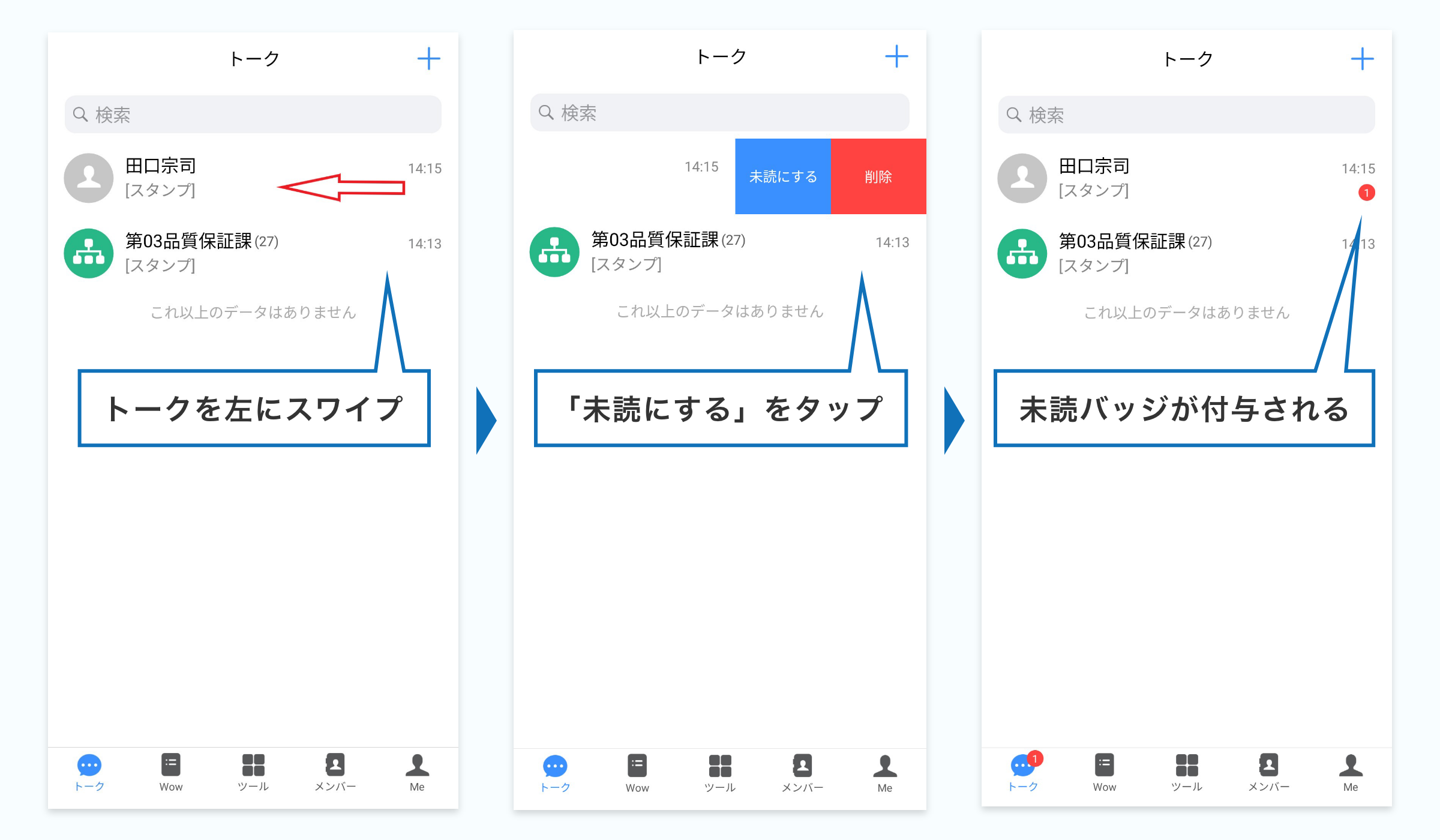 ※本機能により未読バッジを表示したトークルームにおいて新規トークを1つ受信した場合、該当のトークルームのバッジは1と表示されます。新規トークを2つ以上受信した場合は、新規トークの数に応じたバッジが表示されます。