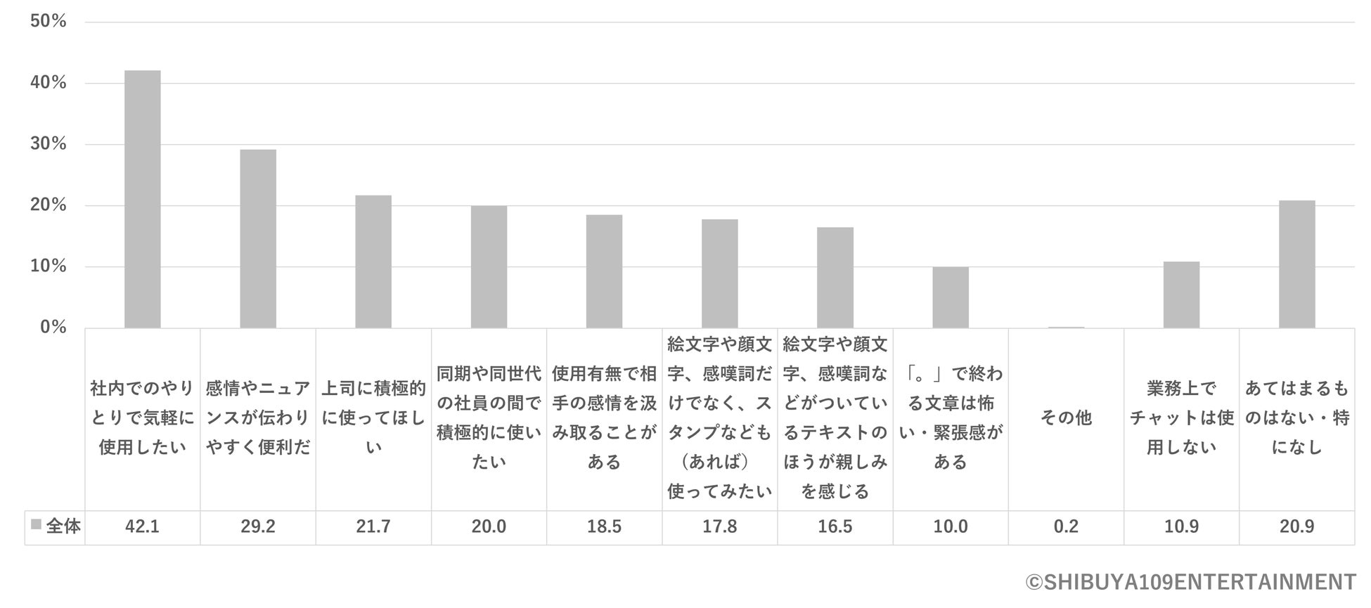 業務上での絵文字の使用については、「社内でのやり取りで気軽に使用したい」という回答が42.1%と最も多い結果となりました。