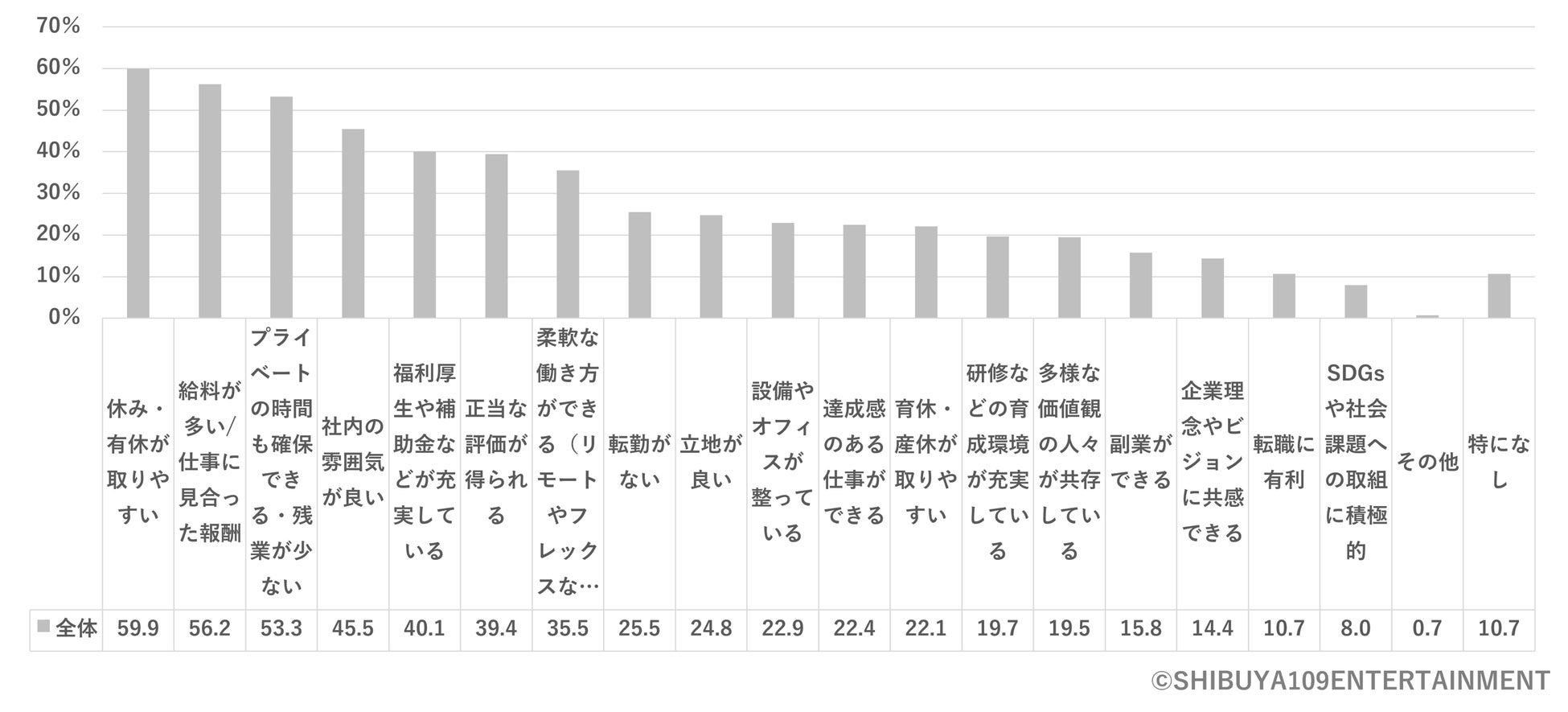 働くZ世代が考える理想の職場※図8は、「休み・有休が取りやすい(59.9%)」「給料が多い/仕事に見合った報酬(56.2%)」「プライベートの時間も確保できる・残業が少ない(53.3%)」といった回答が多く、「達成感のある仕事ができる(22.4%)」「転職に有利(10.7%)」といった、成長を目指す回答よりも上位であることから、よりプライベートとの両立がしやすい環境を理想と考えていることがわかります。
