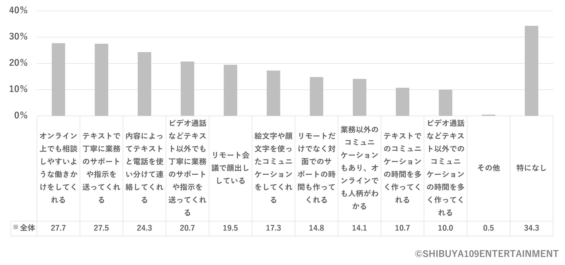また、オンラインにおける理想の上司のサポート※図5についても「オンライン上でも相談しやすいような働きかけをしてくれる(27.7%)」「テキストで丁寧に業務のサポートや指示を送ってくれる(27.5%)」「内容によってテキストと電話を使い分けて連絡してくれる(24.3%)」などが上位になり、コロナ禍でリモートワークが進んだ分、オンラインでもきめ細やかなコミュニケーションができ、話しかけやすい上司像が求められているように見えます。