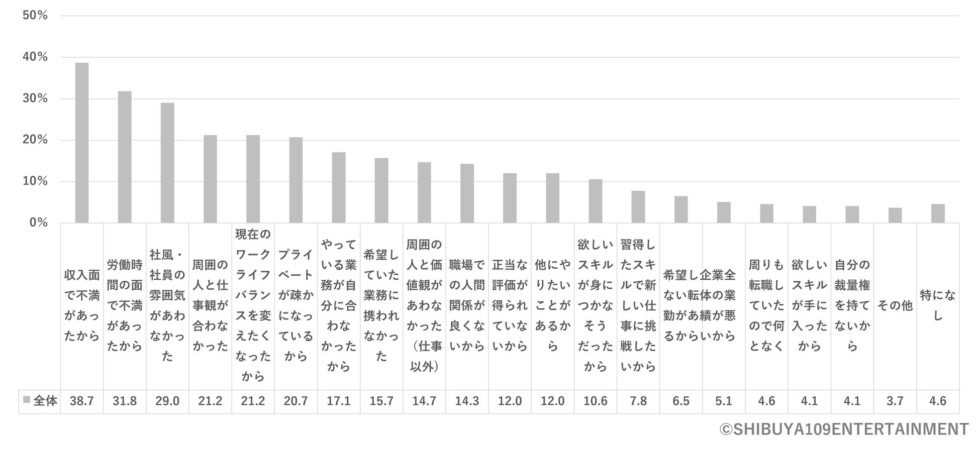 転職意向※図13を聞いてみると、最も多かったのが「転職は考えていない・今の会社でずっと働きたい」で25.1%となり、転職経験や転職意向がある層は52.8%となりました。転職したい理由※図14としては「収入面で不満があった(38.7%)」「労働時間の面で不満があったから(31.8%)」「社風・社員の雰囲気が合わなかった(29.0%)」などが上位にあがっています。