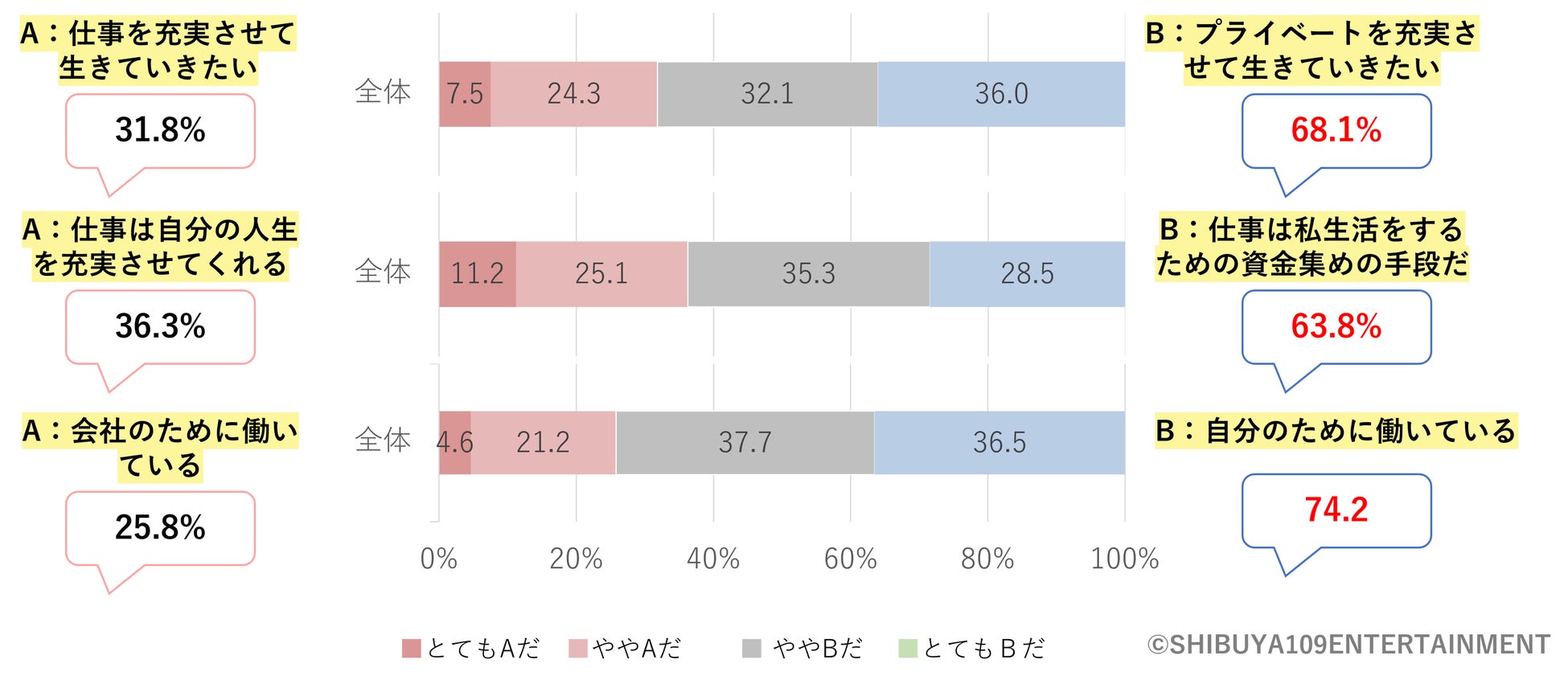 仕事の価値観について※図10の回答も、「仕事の充実」よりも「プライベートを充実させて生きていきたい」と回答したのが68.1%、「仕事で人生を充実させる」よりも「仕事は私生活をするための資金集めの手段だ」と考えているのが63.8%、働くのは「会社のため」ではなく「自分のため」と考えているのが74.2%となりました