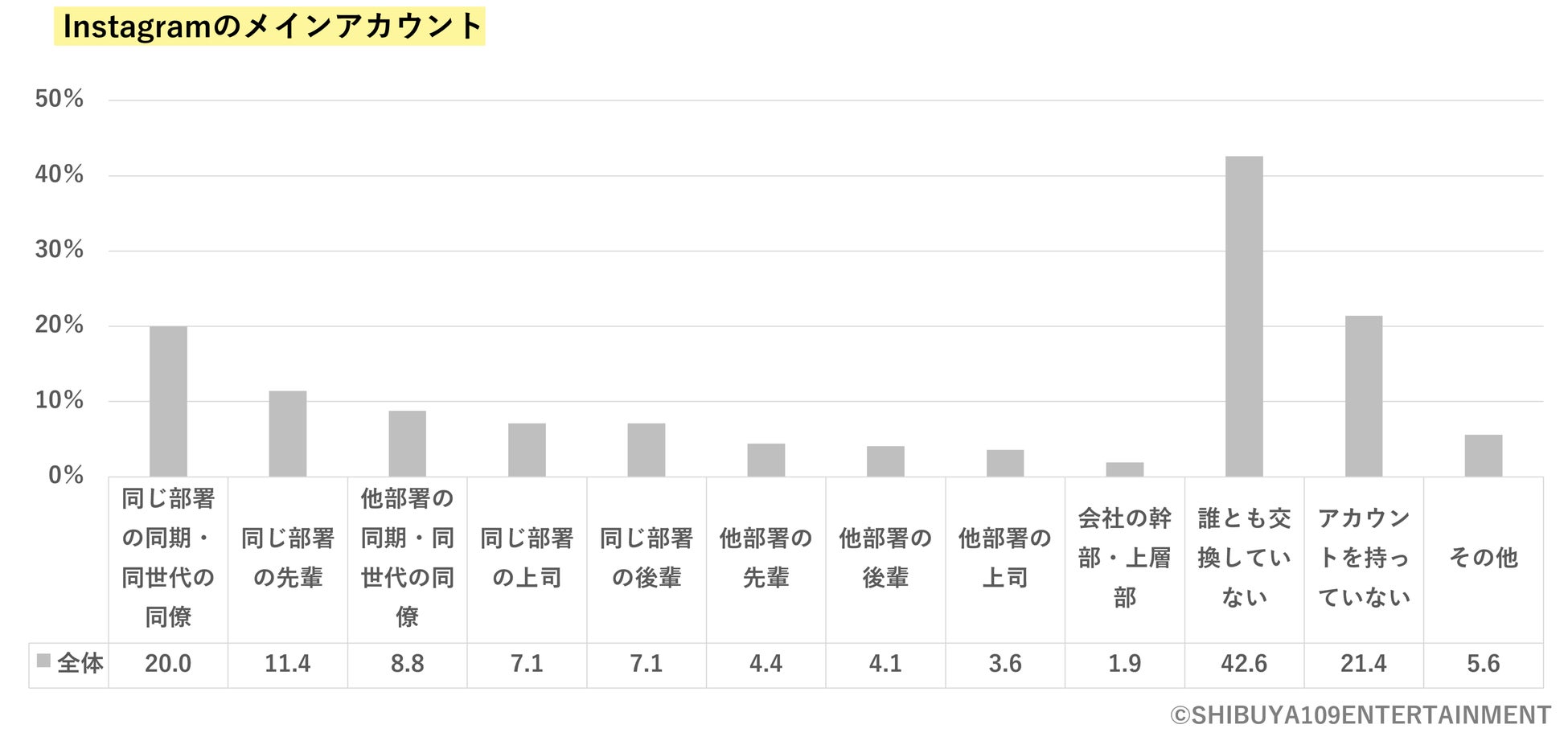 次に、職場でSNSアカウントを交換している相手※図2を調査してみると、グループインタビューでもよく触れられていたInstagramについては「誰とも交換していない(42.6%)」が次点の「同じ部署の同期・同世代の同僚(20.0%)」と大きく差をつけて最多となりました。