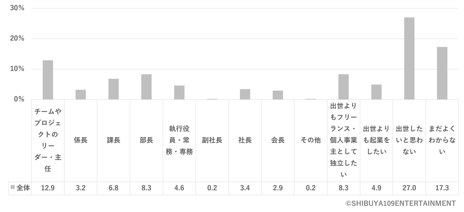 将来的にどこまで出世したいと考えますか」※図11という質問に対し、最も多かったのが「出世したいと思わない(27.0%)」、次いで「チームのプロジェクトやリーダー・主任(12.9%)」という結果となりました。