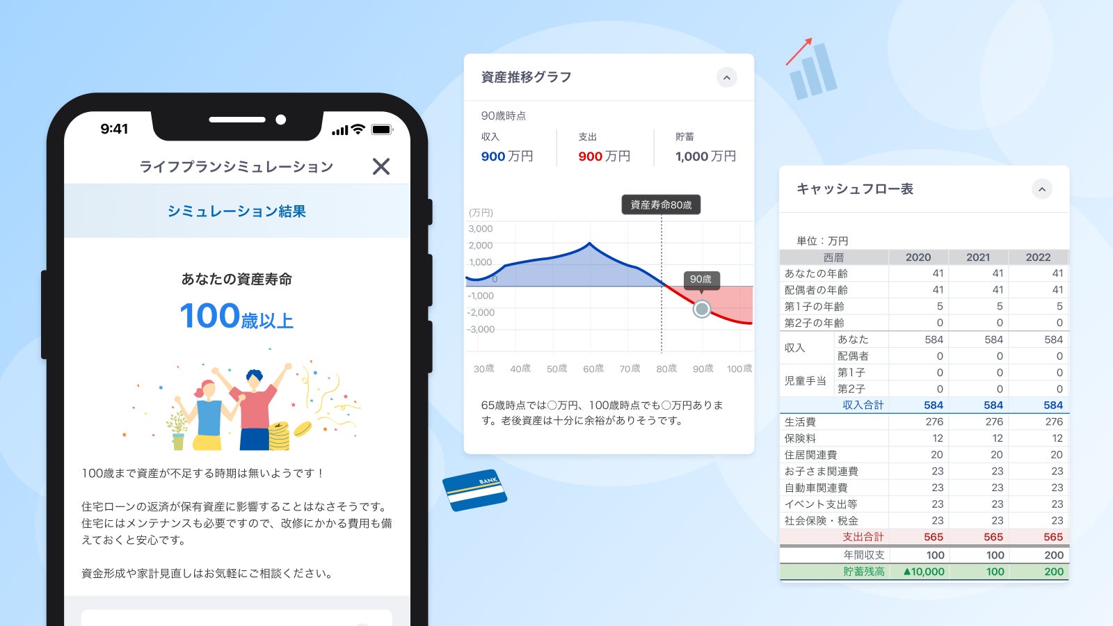 年齢、性別、家族構成、収入、支出などの基本情報やライフイベント情報を入力することで、将来の資産寿命をシミュレーションできます。シミュレーションをすることで、お客さまに新たな発見を提供し、将来の漠然としたお金の不安をシミュレーションで可視化します。