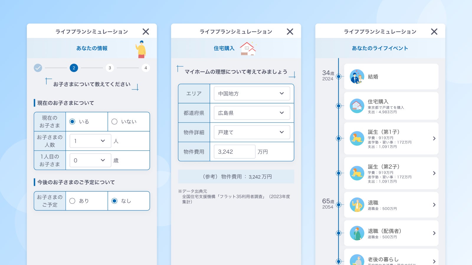MILIZEの「milize Lite(ミライズ ライト)」をベースに高精度なシミュレーション機能を搭載しており、結婚費用、学費、旅費、住宅購入費、介護費など、ライフイベントに関するさまざまな統計値やMILIZEが収集したビックデータが内包されています。