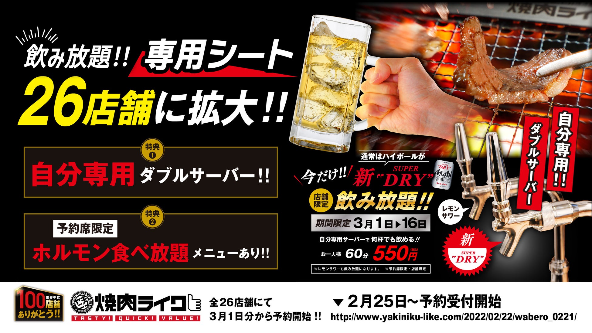 株式会社焼肉ライク(所在地:東京都渋谷区、代表者 有村 壮央)が運営する焼肉のファストフードをコンセプトにした「焼肉ライク」は「究極の自分焼肉」が楽しめる特別席、ワンベロ・ツーベロ専用シートを2021年11月に恵比寿本店で開始。毎月予約殺到の人気席となり、他の店舗でも実地して欲しいというご要望にお応えして、実施店舗を3月1日(火)から26店舗に拡大します。更に通常レモンサワーとハイボールの2種類飲み放題550円のところ、期間限定でアサヒ新スーパードライの生ビールとレモンサワーの2種類飲み放題を同価格で提供します。