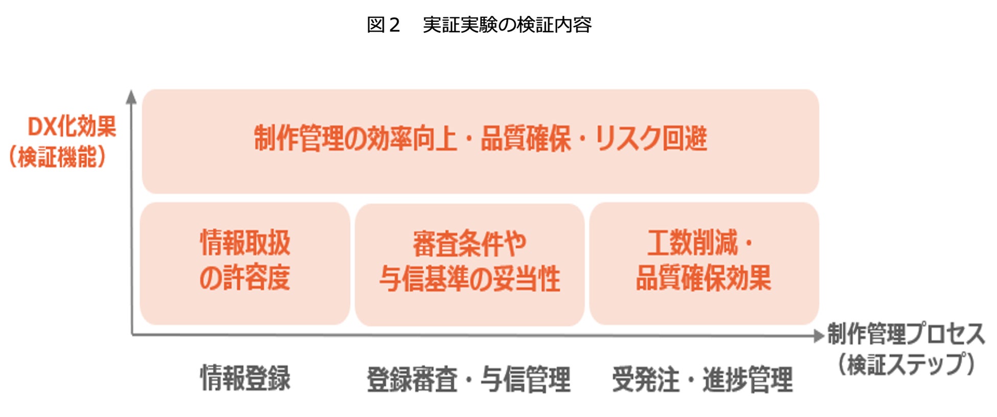 本プラットフォームを用いたコンテンツ制作の効率向上・品質確保・リスク回避の効果や改善点を検証します。具体的には、アカウント申請時の情報登録・取り扱いの許容度、アカウントの審査条件や与信基準の妥当性、コンテンツ制作に必要なオンライン受発注機能や進捗管理機能による工数削減・品質確保の効果を検証します(図2)。