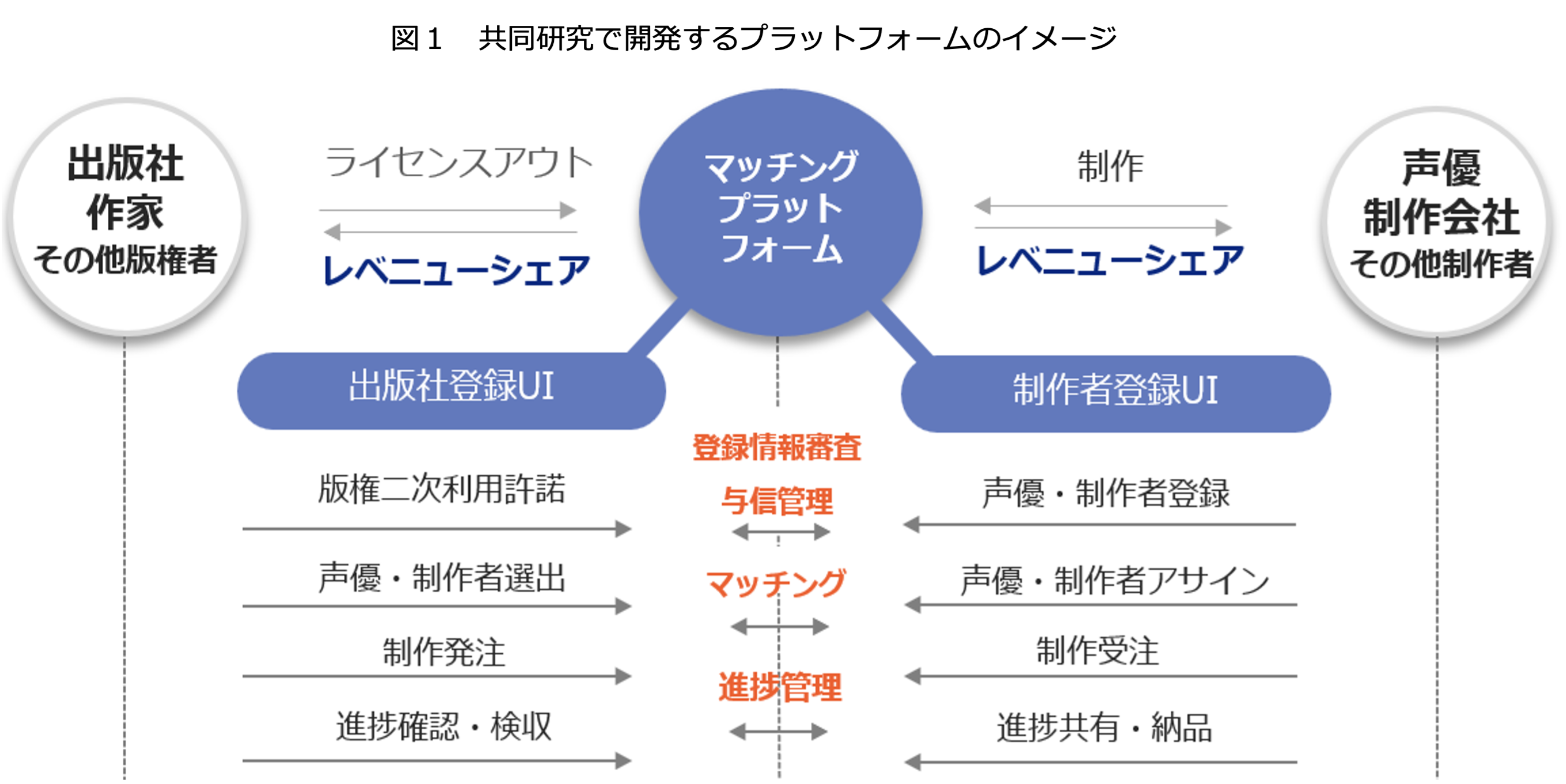 本プラットフォームは、各プレイヤーがアカウント申請するにあたり、登録が必要となる情報を定め審査を行います。また、利用者アカウントの与信管理や進捗共有、品質管理などの機能を具備し、利用者とコンテンツの質を確保します。オープンかつ信頼性が高いプラットフォームを構築することで、より多くの出版社や制作会社のオーディオブック市場への参入を促し活性化を図るとともに、声優・ナレーターの需要拡大を促進します。