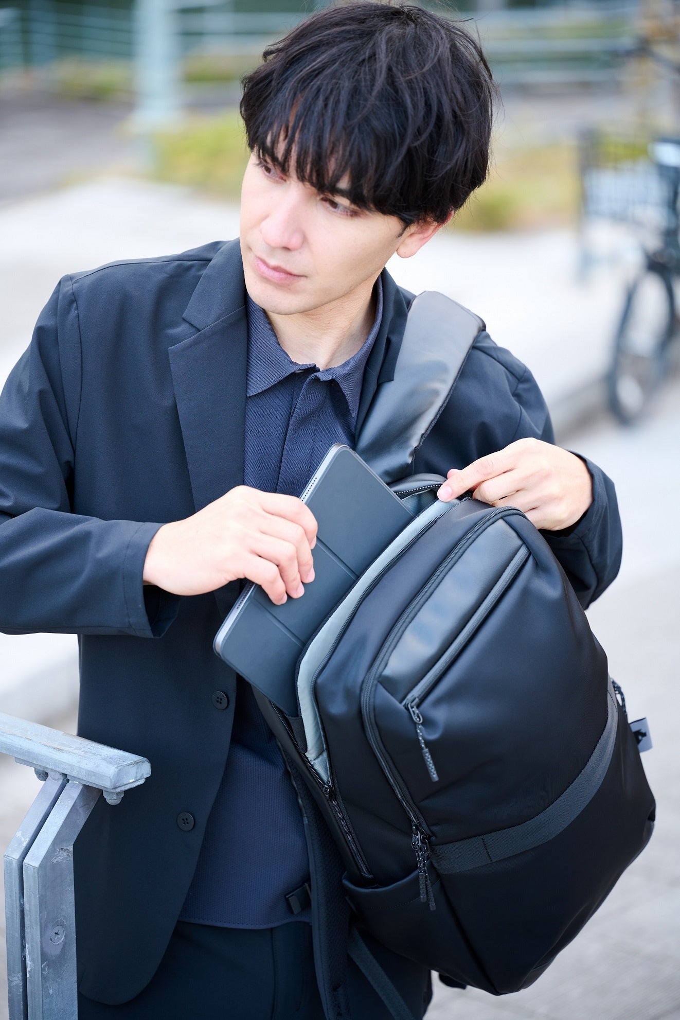 「エアロストリームバックパックforビジネス」に、より使いやすい機能を追加したアップデートモデル。貴重品を収納するポケットには止水ファスナーを配置。