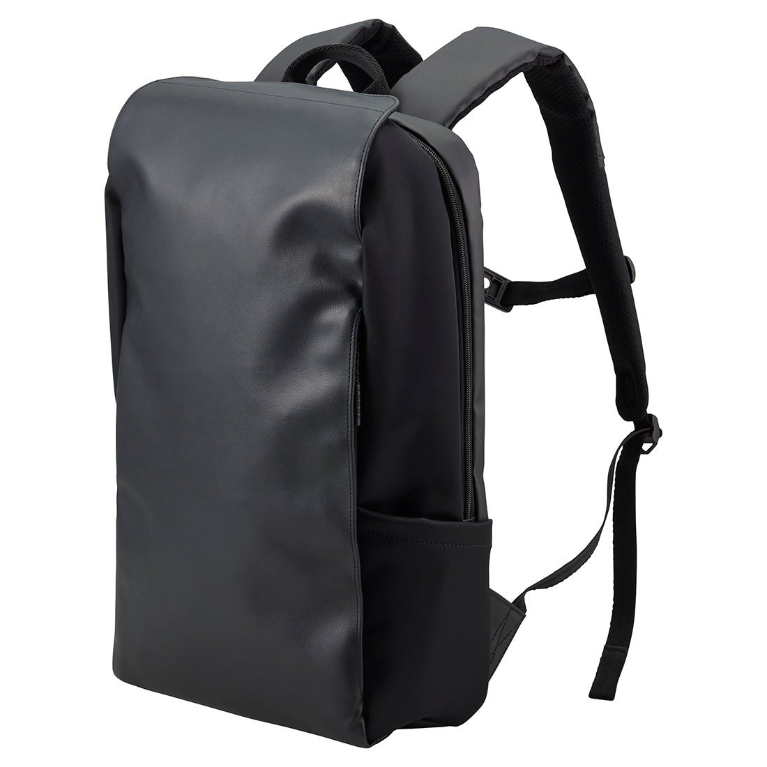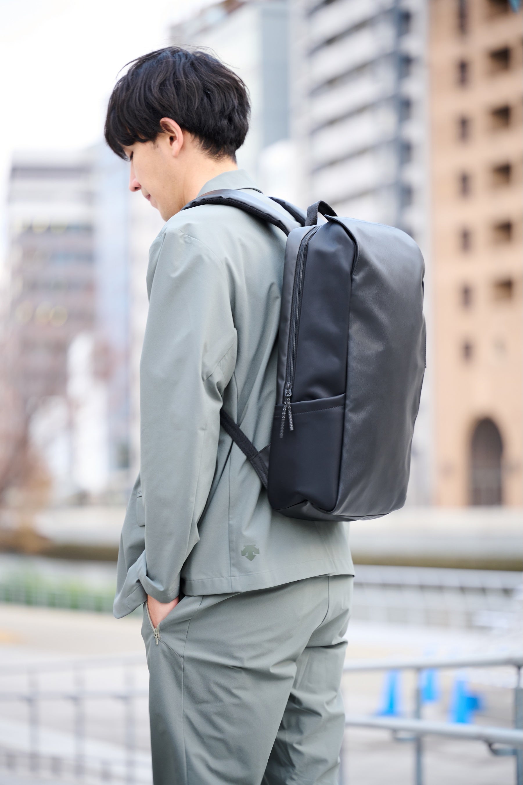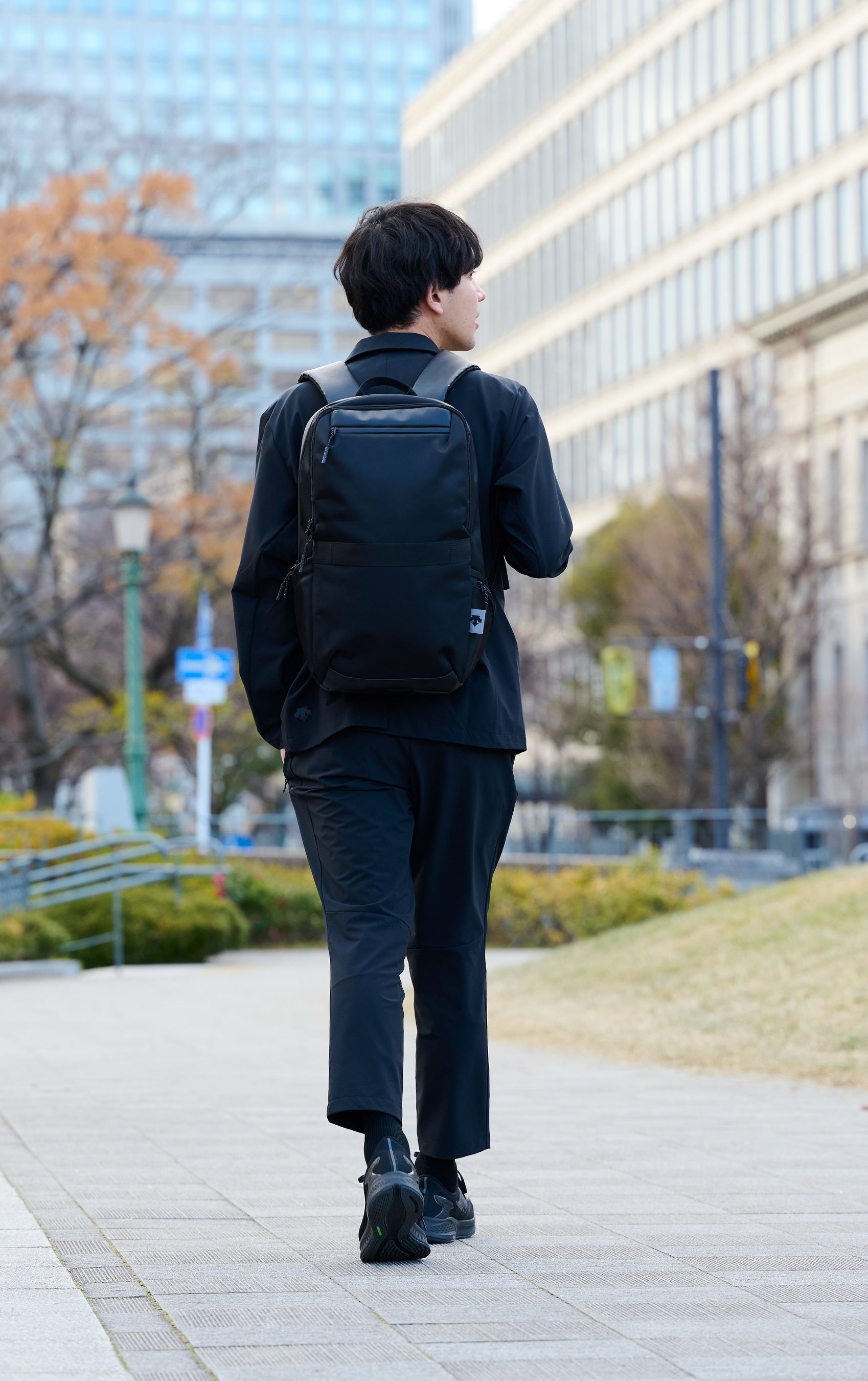 すっきりとしたスクエアなフォルムと簡単に素早く開け閉めしやすいマグネットフラップポケットが特徴のバックパック。スリムなフォルムとブラックで統一されたスタイリッシュなデザインで、ビジネスシーンでも使いやすいアイテム。