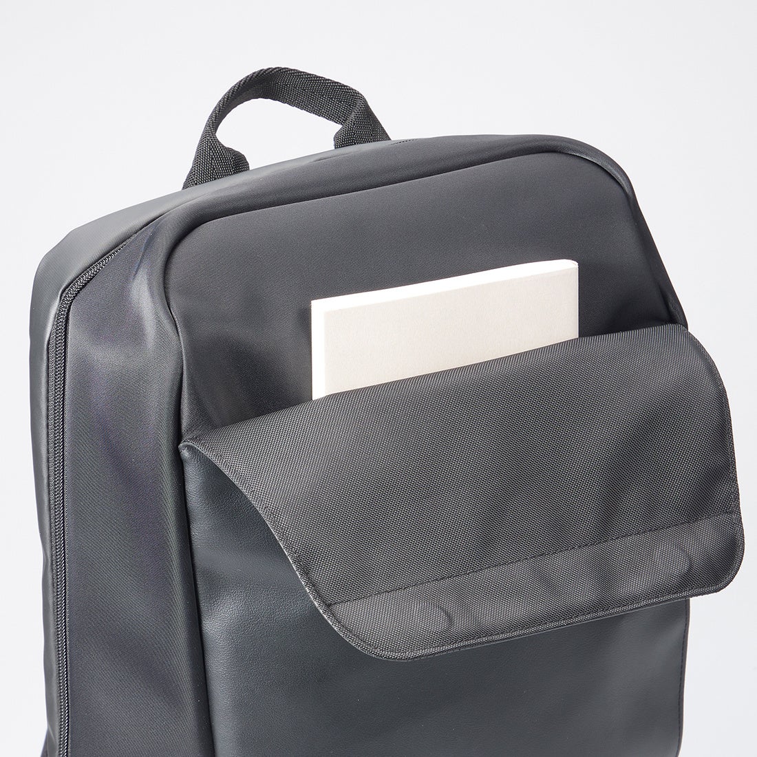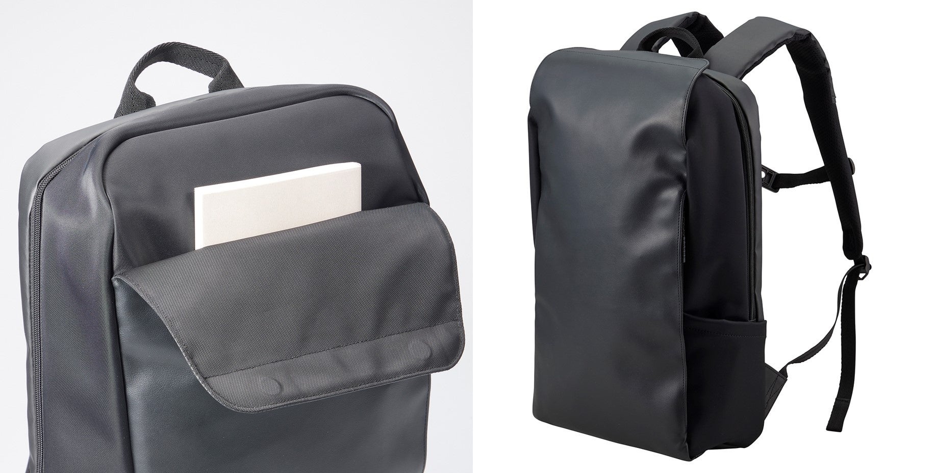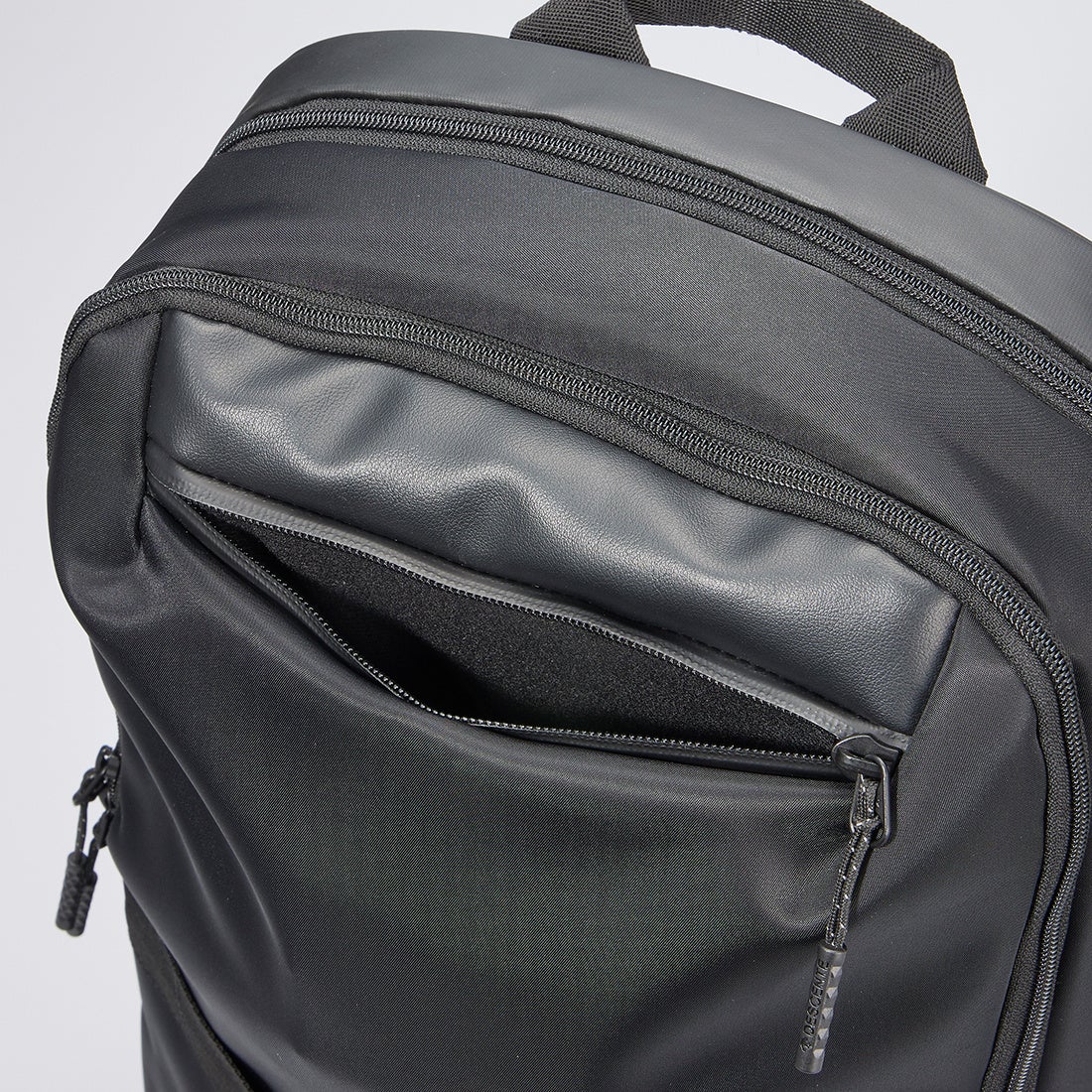 すっきりとしたスクエアなフォルムと簡単に素早く開け閉めしやすいマグネットフラップポケットが特徴のバックパック。スリムなフォルムとブラックで統一されたスタイリッシュなデザインで、ビジネスシーンでも使いやすいアイテム。