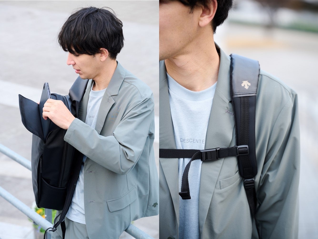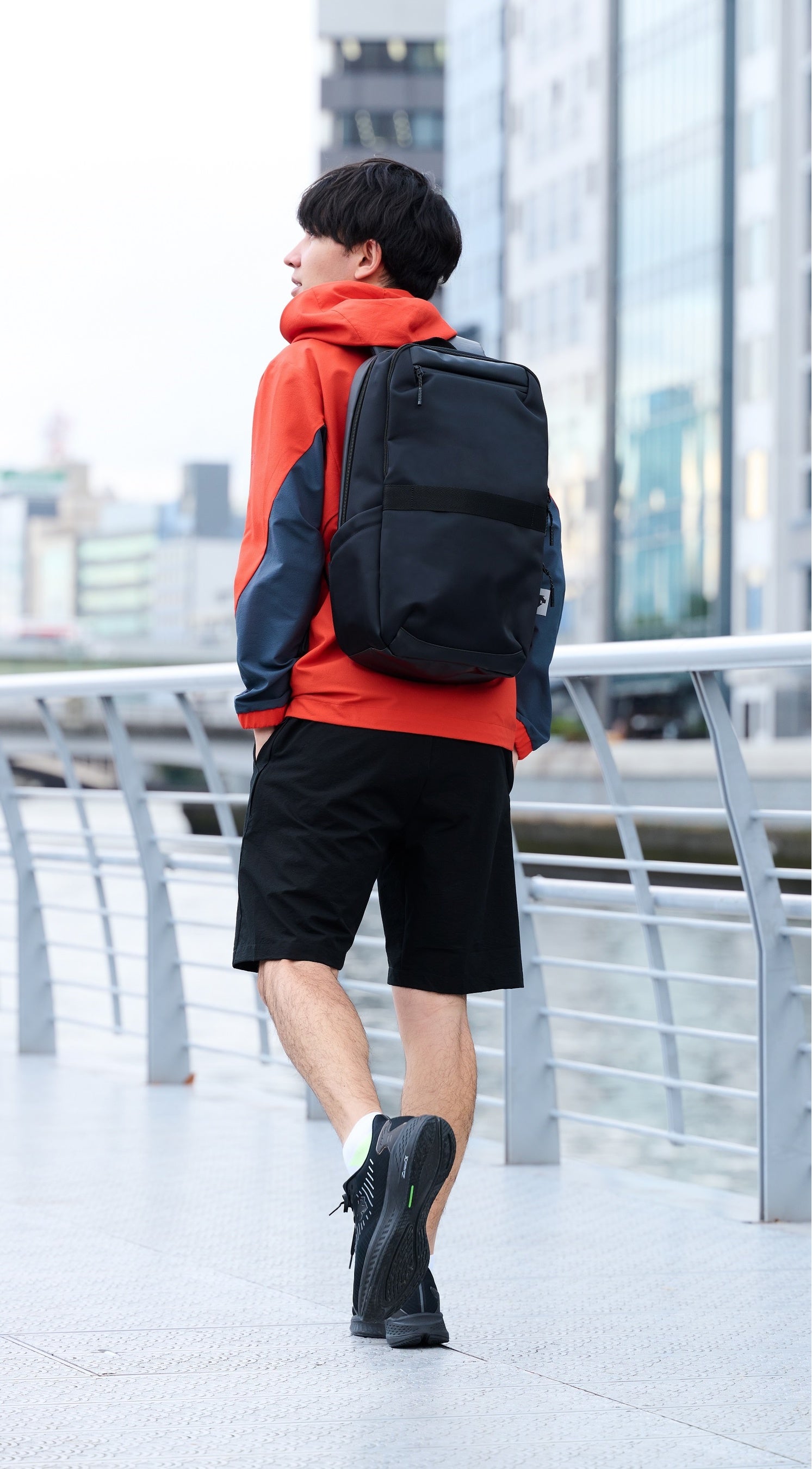 28Lと他のモデルよりも容量が大きいので、日常使いはもちろん、仕事帰りのジム通いや休日のアクティビティ、出張など荷物が多くなりそうなシーンでもマルチに活躍。荷物を背負った際にバッグと体の一体感を出すためにウエストベルトを搭載し、夜間の視認性向上のために、バッグ中央に再帰反射を配置。さらに使いやすい機能的なポケットが盛り沢山。