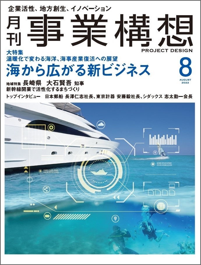 学校法人先端教育機構 事業構想大学院大学(本部:東京都港区、学長:田中里沙)出版部は、企業活性、地方創生、イノベーションの専門誌「月刊事業構想」2022年8月号を、7月1日(金)に発売しました。( https://www.projectdesign.jp/202208 )国土を海に囲まれた日本のビジネスチャンスを探る、大特集は「海から広がる新ビジネス」。海を舞台にした新規事業の方向性やヒントを紹介します。地域特集は、新幹線開業を控え、100年に一度の大変革期を迎える「長崎県」に注目します。