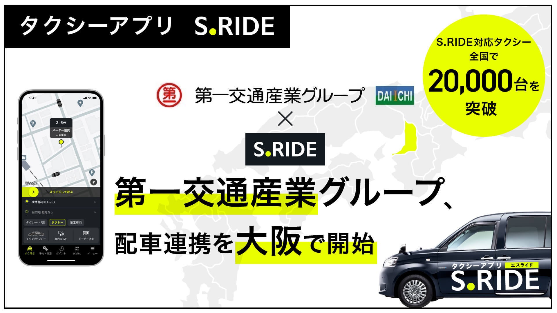 タクシーアプリ 「S.RIDE(エスライド)」を提供するS.RIDE株式会社(本社:東京都港区、代表取締役:橋本洋平、以下S.RIDE)は、2025 年4月21日(月)より、第一交通産業グループの大阪第一交通株式会社、堺第一交通株式会社、南大阪第一交通株式会社の3社とのアプリ配車の連携を開始します。大阪市域交通圏および河南B交通圏において、3社が保有するタクシー車両 約100台がタクシーアプリ「S.RIDE」のサービス導入を開始し、法人契約プラン「S.RIDE Biz」にも対応します。今回の導入により、S.RIDEに対応するタクシーは全国で20,000台を突破し、移動ニーズへの対応力が強化されます。