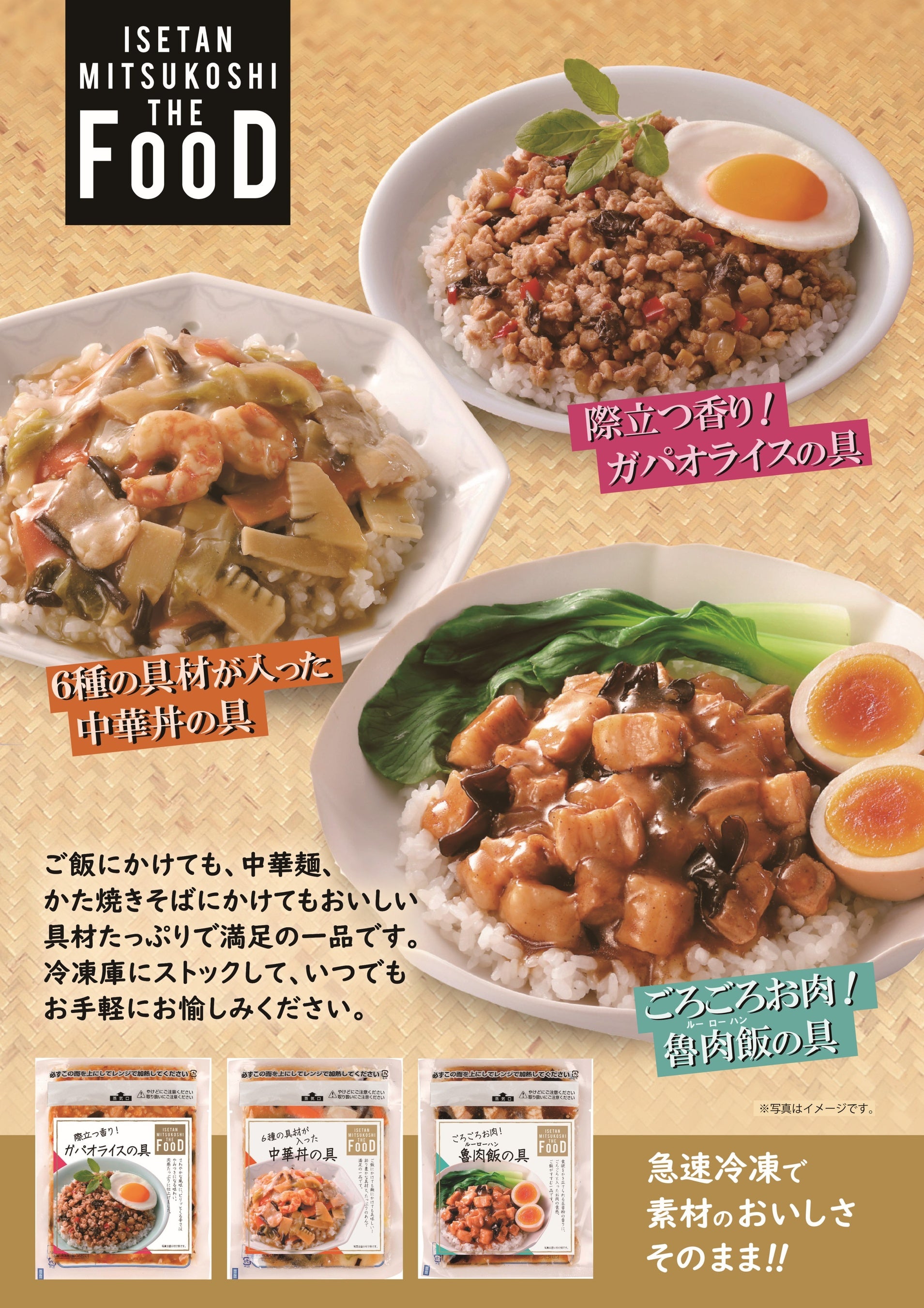 急速冷凍で素材のおいしさそのまま!手軽&簡単!温めてご飯にかけるだけで1品完成!「6種の具材が入った中華丼の具」「ごろごろお肉!魯肉飯(ルーローハン)の具」「際立つ香り!ガパオライスの具」