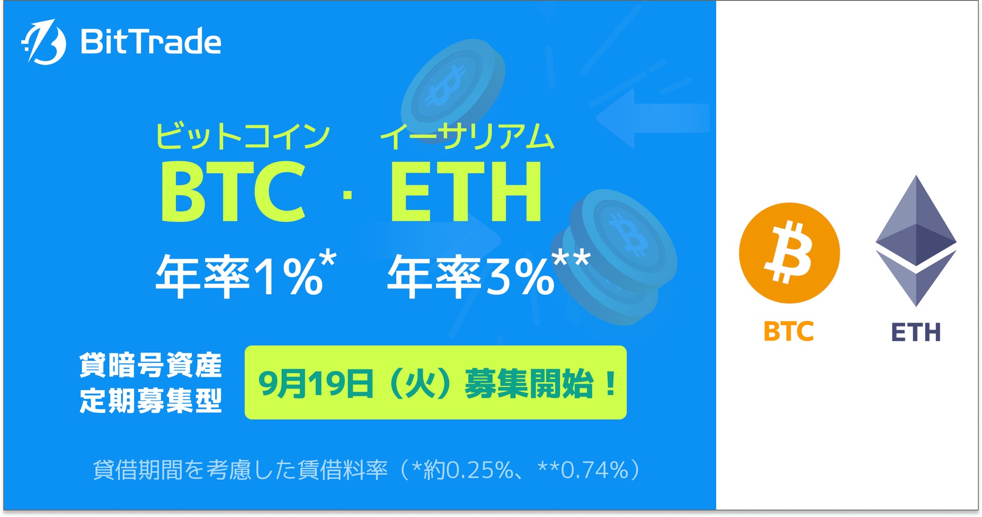 国内暗号資産取引所ビットトレード、【ビットコイン(BTC)、イーサリアム(ETH)貸して増やす・貸暗号資産】定期募集のお知らせ