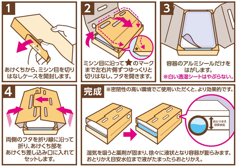 ●湿気を吸ってぐんぐん膨らむ超大容量の使い捨てタイプの湿気とりです。