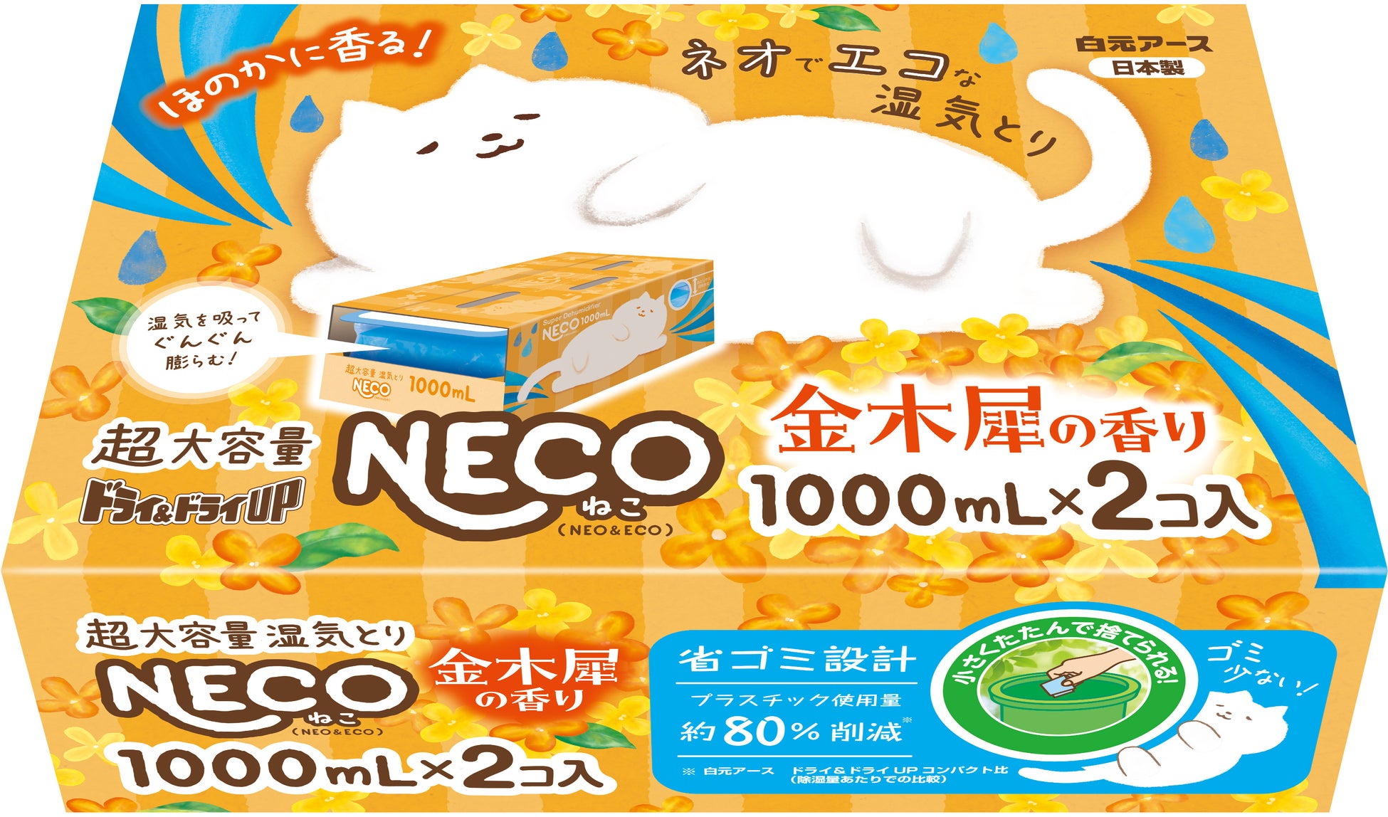 今回発売する『ドライ&ドライUP NECO 金木犀の香り 1000mL』は、NECOの商品特長はそのままに、甘くて心地よい金木犀の香りが広がり収納空間をスッキリ爽やかにします。押入れ、洋服ダンス、クローゼット、下駄箱、流しの下など、家の中の湿気とニオイが気になる様々な場所にご使用いただけます。