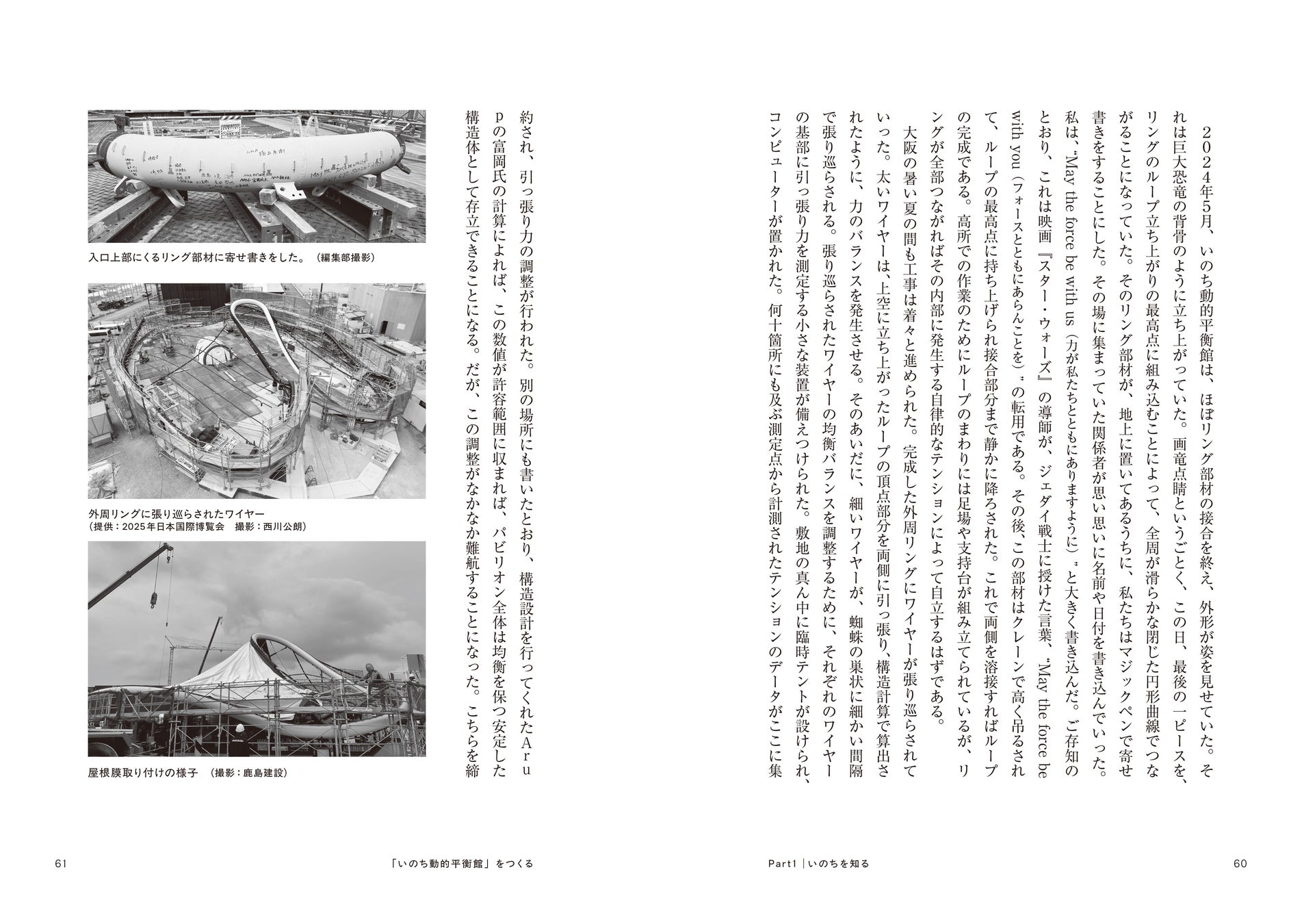 2025年3月、完成したパビリオンと内部展示の最終確認をした私は、不思議な浮遊感と高揚感に包まれた。私の頭の中にだけあった小さなアイデアは、今、このように大きな具体物として目の前にある。これは私だけの力では到底達成できなかったことである。LEDの光の一粒から、ワイヤーを留めるネジの一本まで、ありとあらゆる細部に宿る、数え切れない人たちの献身的な、―それこそ利他的な―、協働と共生、協賛と協力によって初めて成り立ったことである。ここにあらためて感謝の言葉を捧げたい。