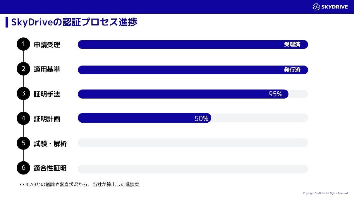 日本の国土交通省と全般計画書(General Certification Plan)の合意に至ったことは、極めて大きなマイルストーンの達成です。これは認証プロセスにおける大きなリスク低減を意味しており、当社の機体がJCABおよびFAAの認証取得に向けて正しい軌道に乗っていることの証でもあります。 型式証明プロセスにおいてこの段階に到達しているプレイヤーは、世界でもごく限られています。2028年のグローバルな商用化を見据え、開発を進めてまいります。