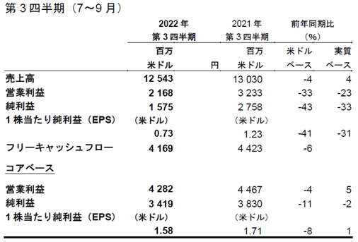 ■2022年1-9月期の売上高は実質ベース 5%増(米ドルベース 1%減)、コア営業利益は実質ベース 6%増(米ドルベース 1%減)となり、力強い業績を達成:
