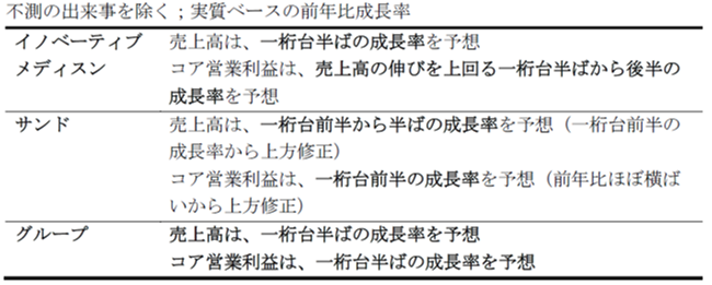 ■ノバルティス グループの2022年通期業績予想(売上高およびコア営業利益の一桁台半ばの成長率)を確認。サンドの通期業績予想を、売上高は一桁台前半から半ばの成長率(これまでの予想:一桁台前半の成長率)、コア営業利益は一桁台前半の成長率(同:前年比ほぼ横ばい)に上方修正