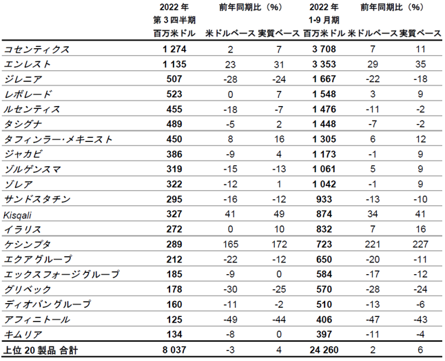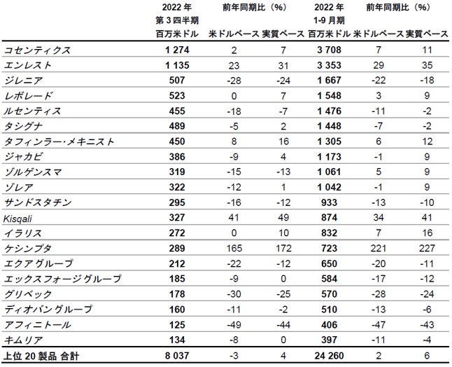 2022年1-9月期の売上高は、販売量の12ポイントの伸びと、価格低下による4ポイントならびにジェネリック医薬品との競合による3ポイントのマイナス影響があり、379億米ドル(1%減、実質ベース 5%増)となりました。