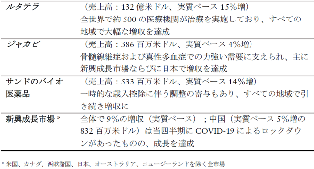 サンドの売上高は、69億米ドル(3%減、実質ベース 6%増)となりました。販売量による貢献は13ポイントあり、価格によるマイナス影響は7ポイントでした。欧州の売上高は36億米ドル(7%減、実質ベース 5%増)、米国の売上高は13億米ドル(1%減)、その他の地域の売上高は20億米ドル(6%増、実質ベース 12%増)でした。売上高の伸びは、上半期に咳・風邪の流行が拡大したことと通常の事業ダイナミクスへの回帰があったことが追い風になりました。バイオ医薬品の全世界での売上高は、16億米ドル(1%増、実質ベース 11%増)に増加しました。